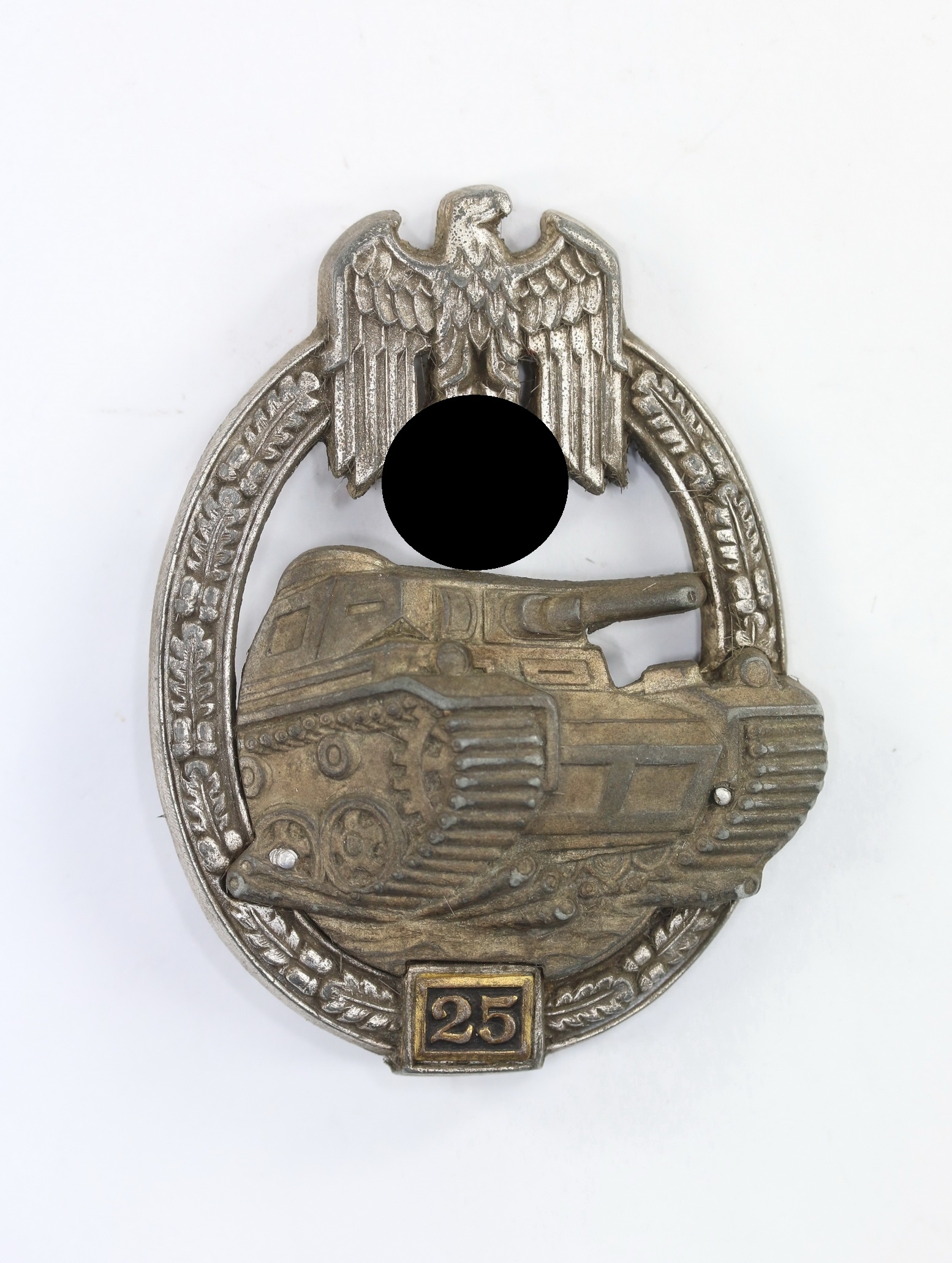 Zink, mehrteilig, sehr guter, minimal getragener Zustand. Mit vollständiger, typischer Versilberung, der Panzer mit vollständiger dunkler Tönung. Mit leichter Patina. Der Panzer separat aufgesetzt. Wie typisch für frühe Juncker Stücke mit durchgeniteten Aluminium Nieten. Ohne Hersteller, aber eine bekannte Variante der Firma C.E. Juncker, Berlin. Siehe Philippe de Bock, The German Panzer Assault Badge.
