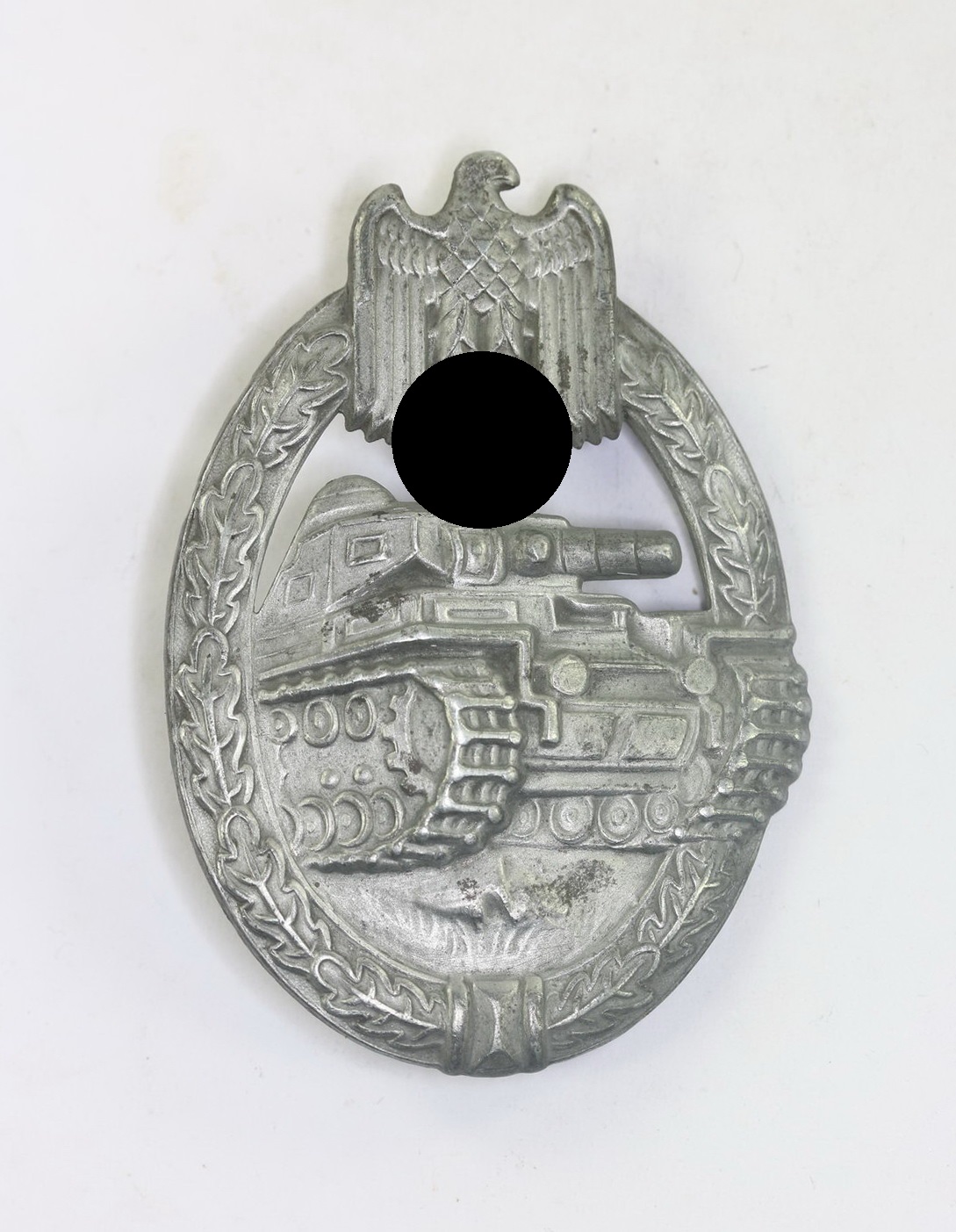 Zink, hohl geprägt. Sehr guter, leicht getragener Zustand. Mit noch schöner Versilberung und leichter Patina. Ohne Hersteller Markierung, aber eine bekannte Variante, der Firma Otto Schickle aus Pforzheimn. Siehe Philippe de Bock, The German Panzer Assault Badge.