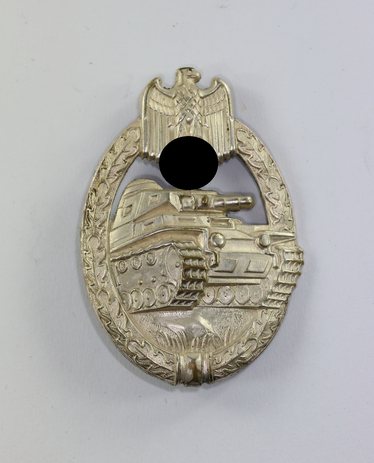 Buntmetall, excellenter, ungetragener Zustand. Mit vollständiger Versilberung, Hakenkreuz und Kanten poliert. Ohne Hersteller, aber eine bekannte Variante, der Firma Steinhauer & Lück, Lüdenscheid. Siehe Philippe de Bock, The German Panzer Assault Badge S. 128/129, Typ 1.4.1.