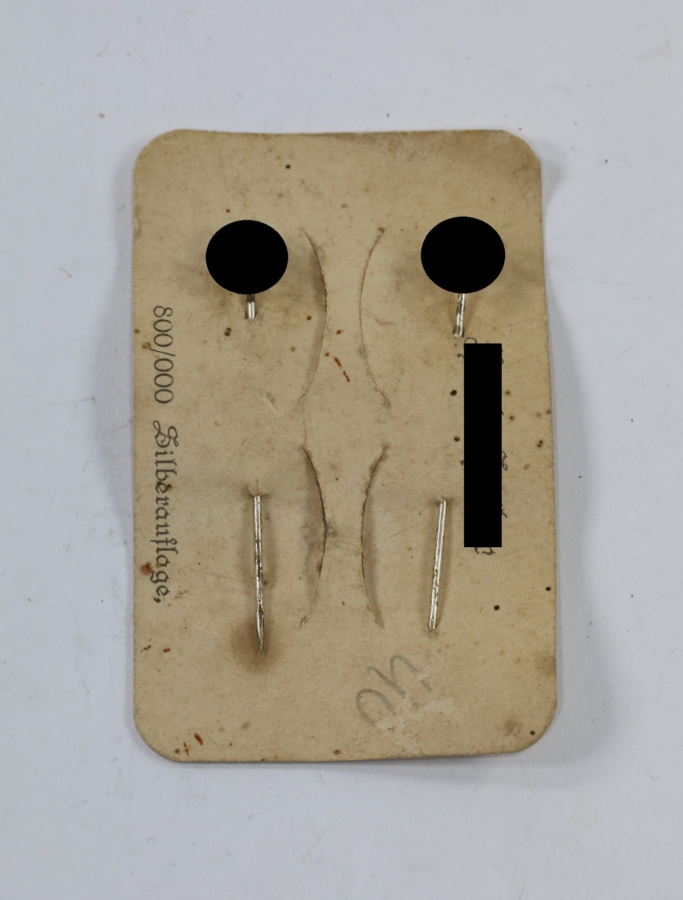 Zwei Nadeln mit Hakenkreuz. Buntmetall versilbert, sehr guter, ungetragener Zustand. Noch auf der originalen Verkaufspappe. Hakenkreuz ca. 6 x 6 mm. Aus Juweliers Nachlass.