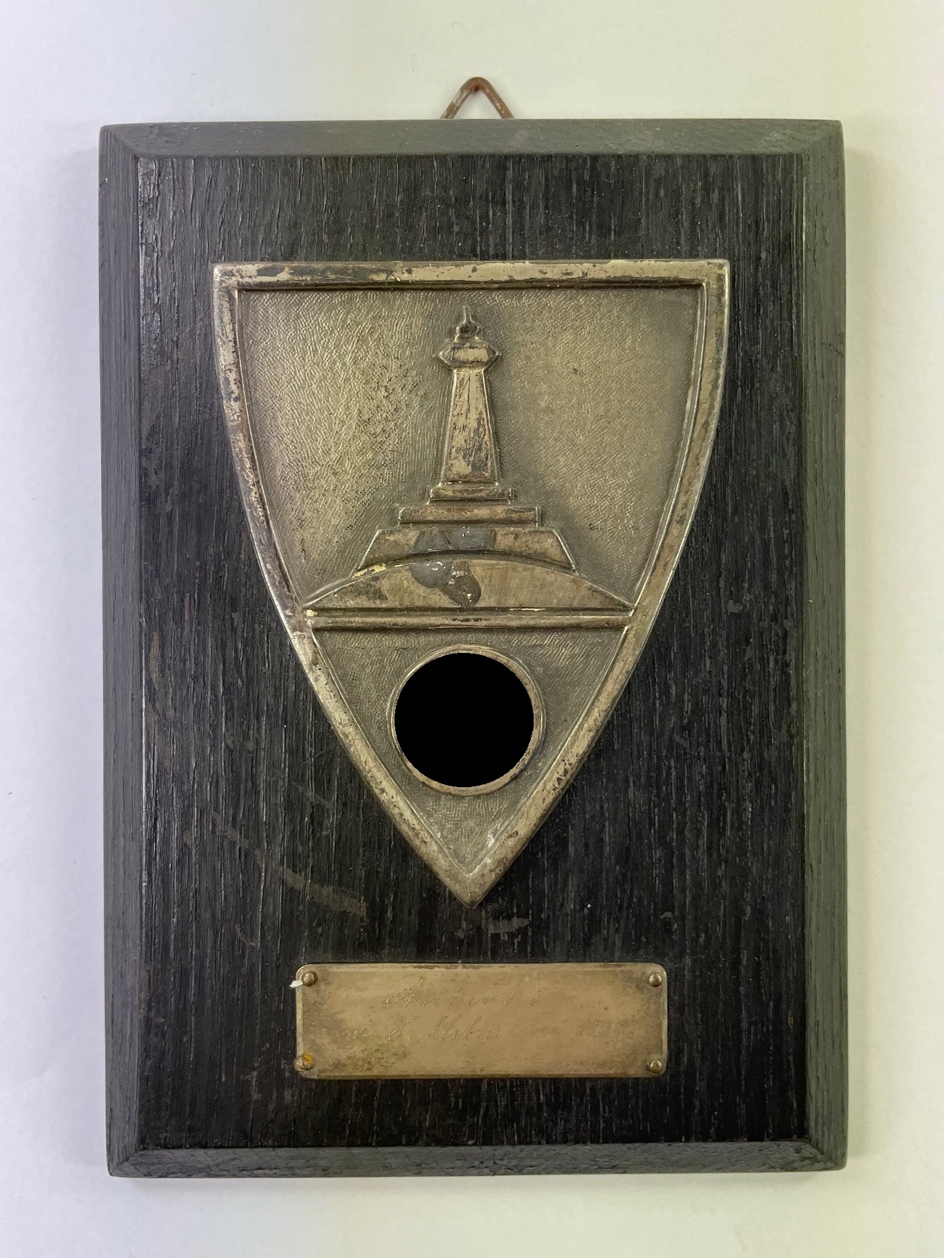 Sehr guter, nur leicht gberauchter Zustand. Schwarzes Holz mit Metall Auflage. Hinten mit Hänger. maße ca. 11,5 x 15 cm.