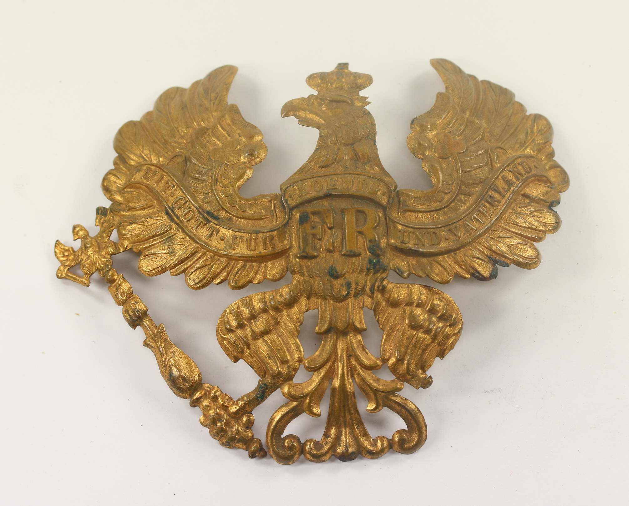 Buntmetall vergoldet, der Reisapfel abgebrochen(!), sonst sehr guter, nur leicht getragener Zustand.