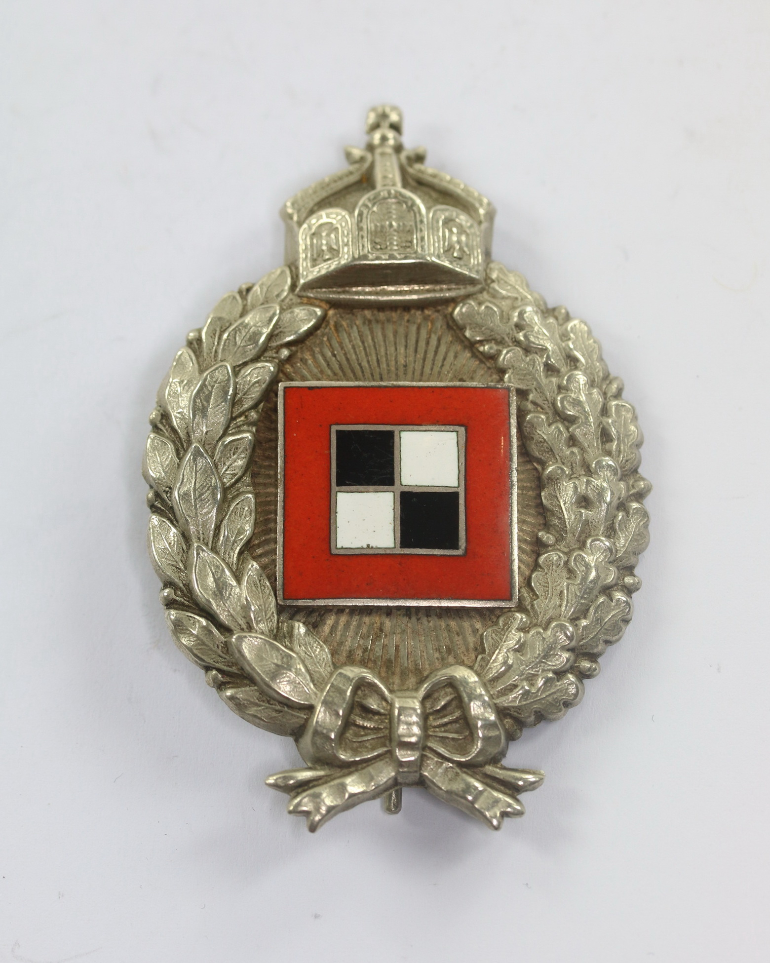 Buntmetall versilbert, mittig hohl verbödet, sehr guter, nur minimal getragener Zustand, die Emaille ohne Fehler. Ohne Hersteller, aber eine bekannte Variante der Firma C.E. Juncker, Berlin. Siehe Carsten Baldes, Abzeichen und Ehrenpreise der Fliegertruppe 1913 – 1920 S. 244.