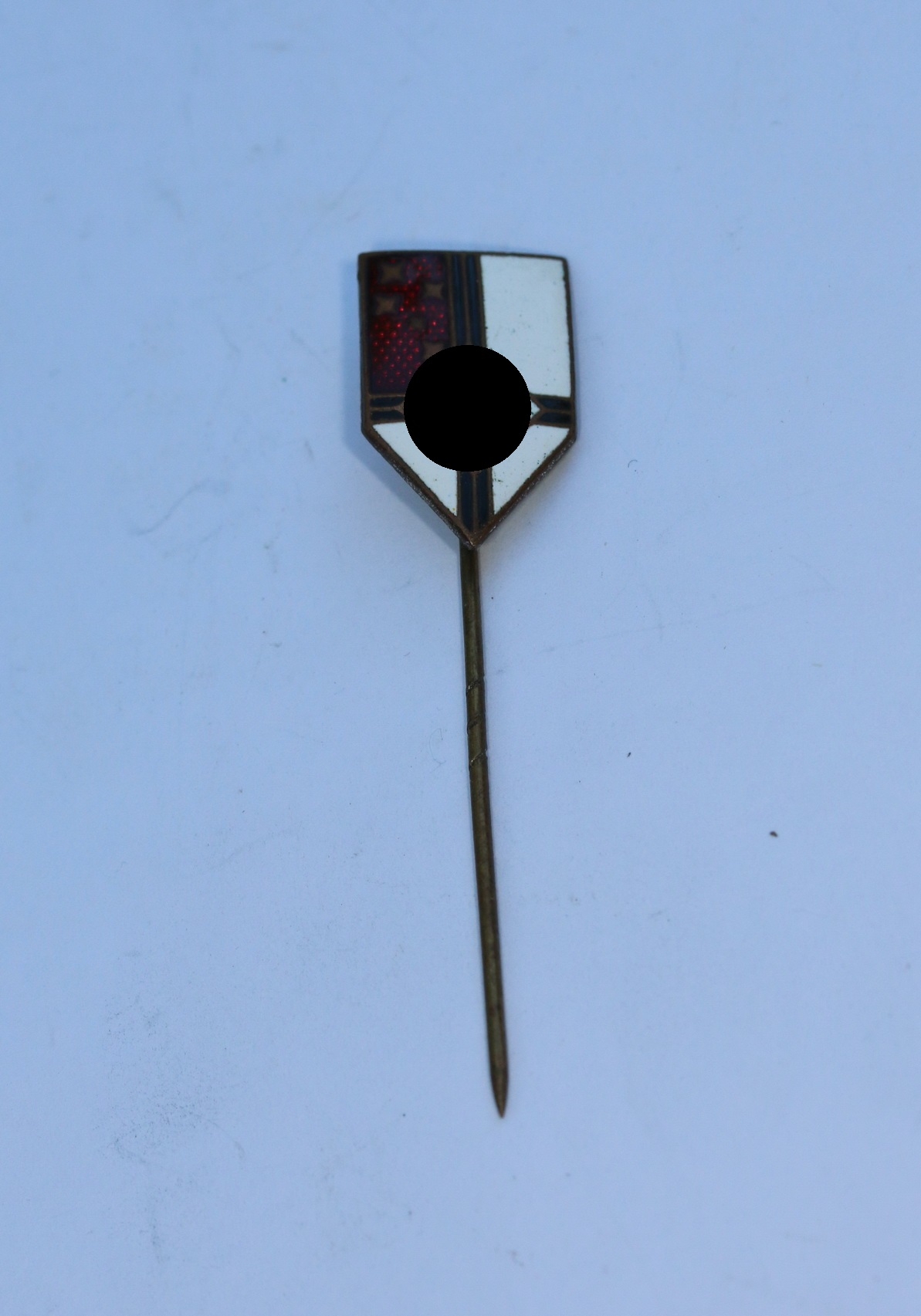 Buntmetall, emailliert, sehr guter, nur minimal getragen, die Emaille ohne Fehler. Mit Herstellerzeichen „L“ und „Ges. Gesch.“.