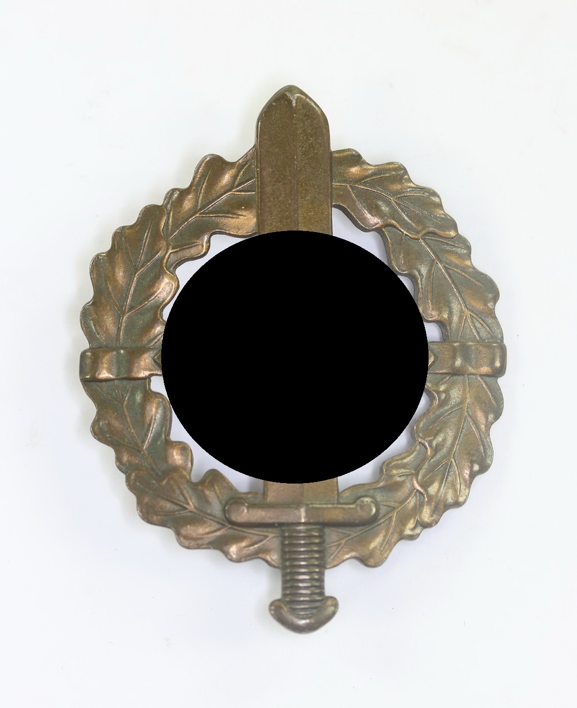 Eisen bronziert, sehr guter, nahezu ungetragenen Zustand. Mit vollständiger Bronzierung. Rückseitig „SA Wehrabzeichen in Bronze, Eigentum D.S.A. Sportabzeichen Hauptstelle“.