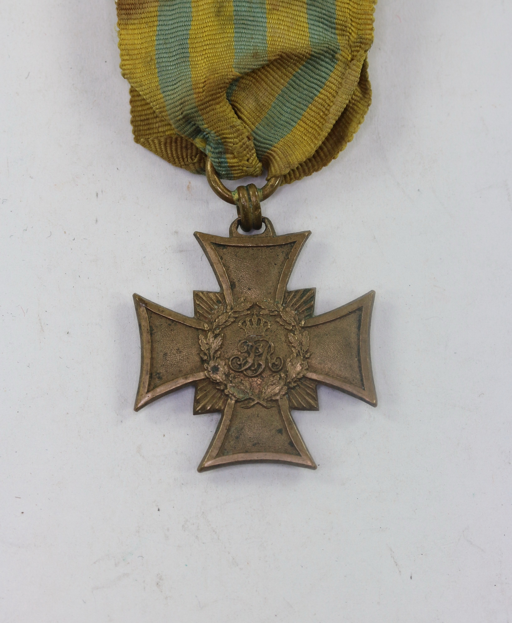 Bronze, sehr guter, nur leicht getragener Zustand. An alten, original Kämpferband.