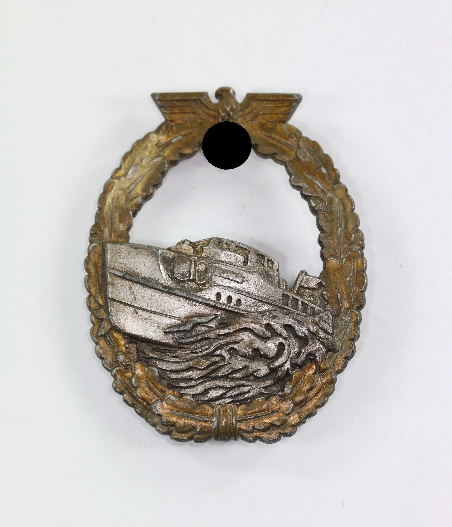 Zink, sehr guter, minimal getragener Zustand. Der Kranz mit fast vollständiger Vergoldung, das Boot mit vollständiger Versilberung. Mit leichter Patina. Mit Hersteller „L/21“ für die Firma Förster & Barth, Pforzheim. Siehe GCA-Datenbank.