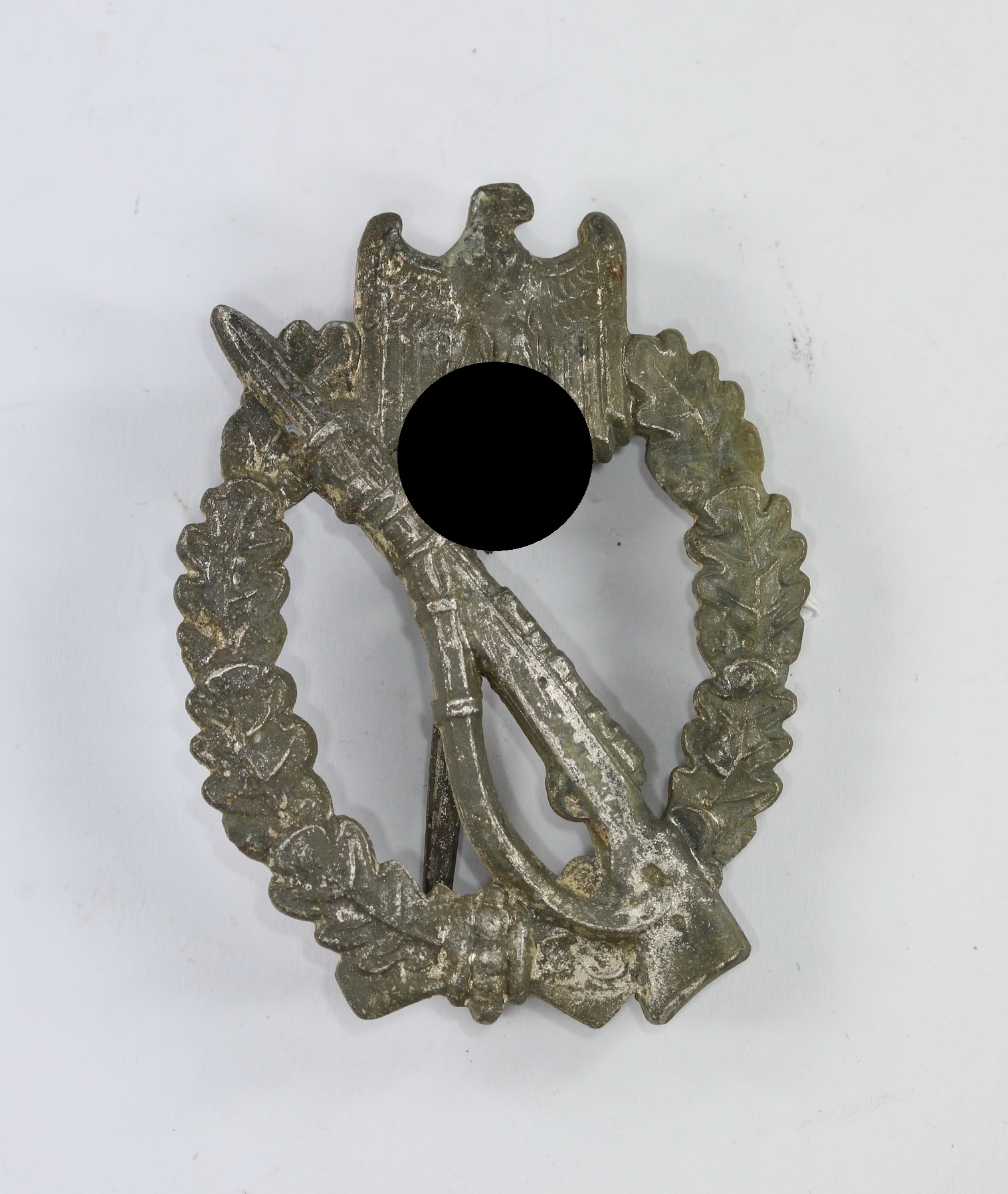 Zink, sehr guter, leicht getragener Zustand. Mit Patina und Alterspuren, sonst mit vollständiger Versilberung. Mit Hersteller „ÜÜ“ für die Firma Ferdinad Wiedmann, Frankfurt am Main. Siehe auch GCA-Datenbank. Mit den markanten Nadelbock und der seltenen, breiten Nadel.