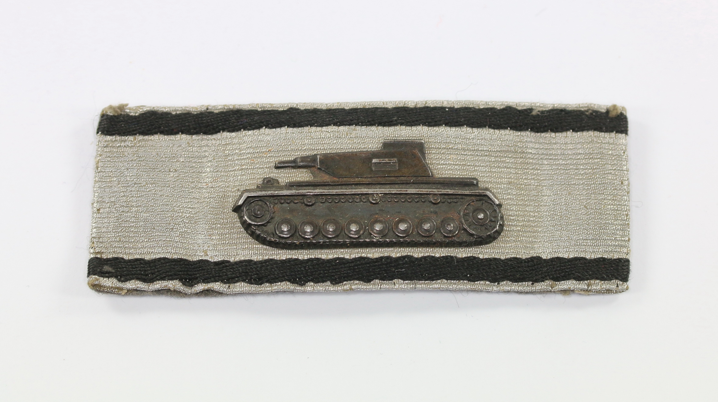 Sehr guter, ungetragener Zustand. Der Panzer aus geschwärzten Eisen. Vollständig mit allen drei Splinten, der Gegenplatte und der für frühe Stücke typischen Abdeckung aus blauen Filz. Ohne Hersteller, aber eine bekannte Variante, siehe Dirk Schneider, Das Panzervernichtungsabzeichen sowie das Tieffliegervernichtungsabzeichen. Maße ca. 85 x 30 mm.