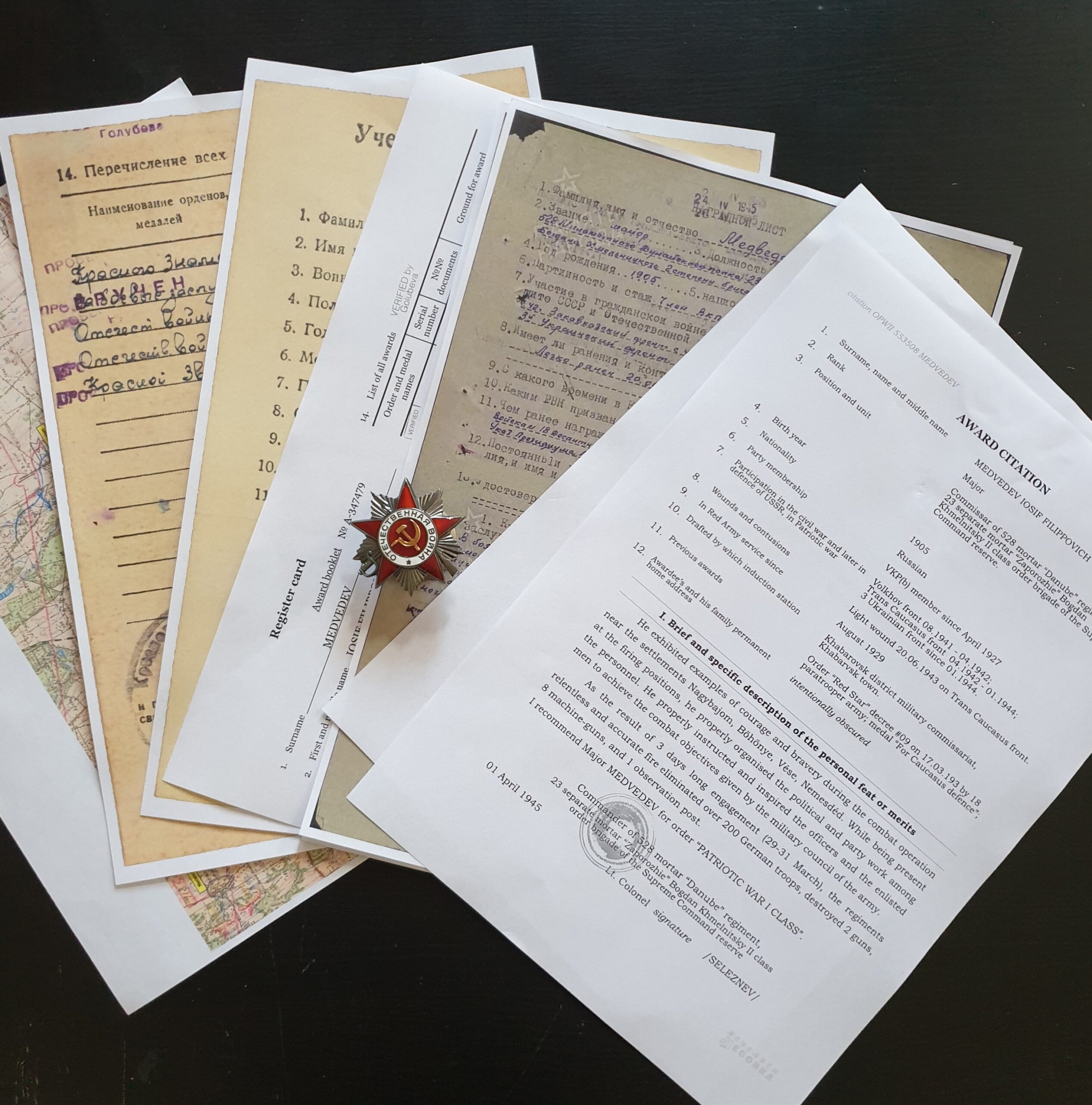 Mit Recherchematerial aus dem russischen Archiv. Bestehend aus Registerkarte, Ordensliste, Verleihungs Vorschlag und Dekret. Das Vorschlag, Registerkarte und Ordensliste ins Englische übersetzte sowie eine Karte des im Zitat genannten Gebietes.