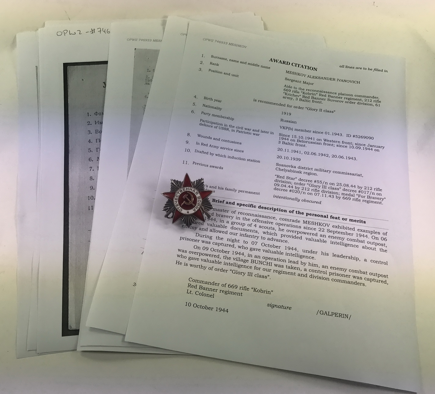 Mit Forschungsmaterial aus dem russischen Archiv. Bestehend aus Registerkarte, Auszeichnungsliste, Verleihungsvorschlag und Dekret, das vorschlag ins Englische übersetzt.