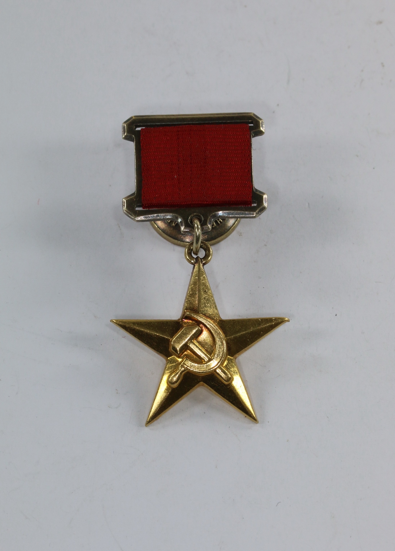 Gold, Stern, darauf Kammer und Sichel. Sehr guter, nahe zu ungetragener Zustand. An Tragespange, mit Haltemutter, darauf „MONETNY DWOR“ (Staatliche Münze). Mit Verleihungsnummer „19080“. Goldgewicht ca. 15 g.