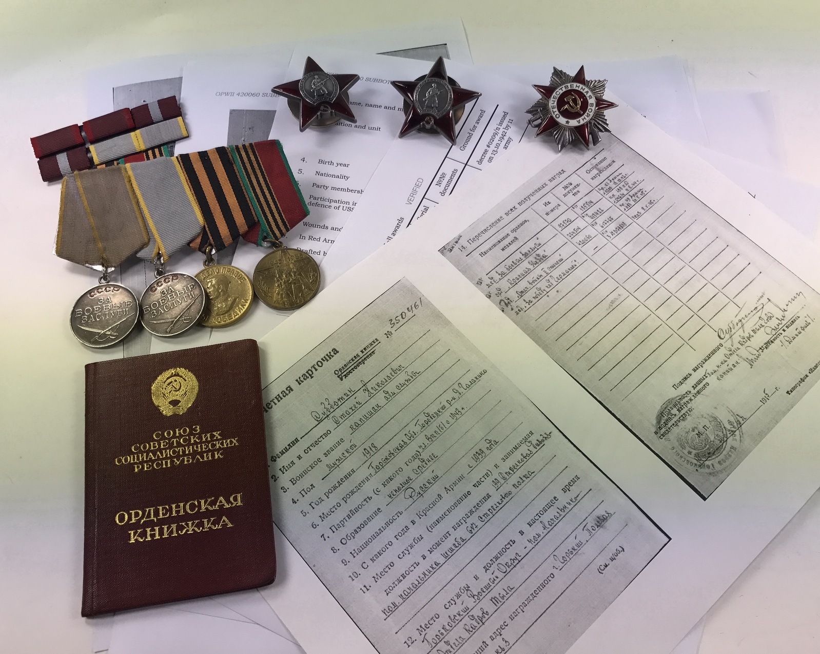 Auch Forschungsmaterial aus den russischen Archiven bestehend aus Registerkarte, Auszeichnungsliste, Dekret und Verleihungsvorschlag. Die Registerkarte und Auszeichnungsliste wurden ins Englische übersetzt.