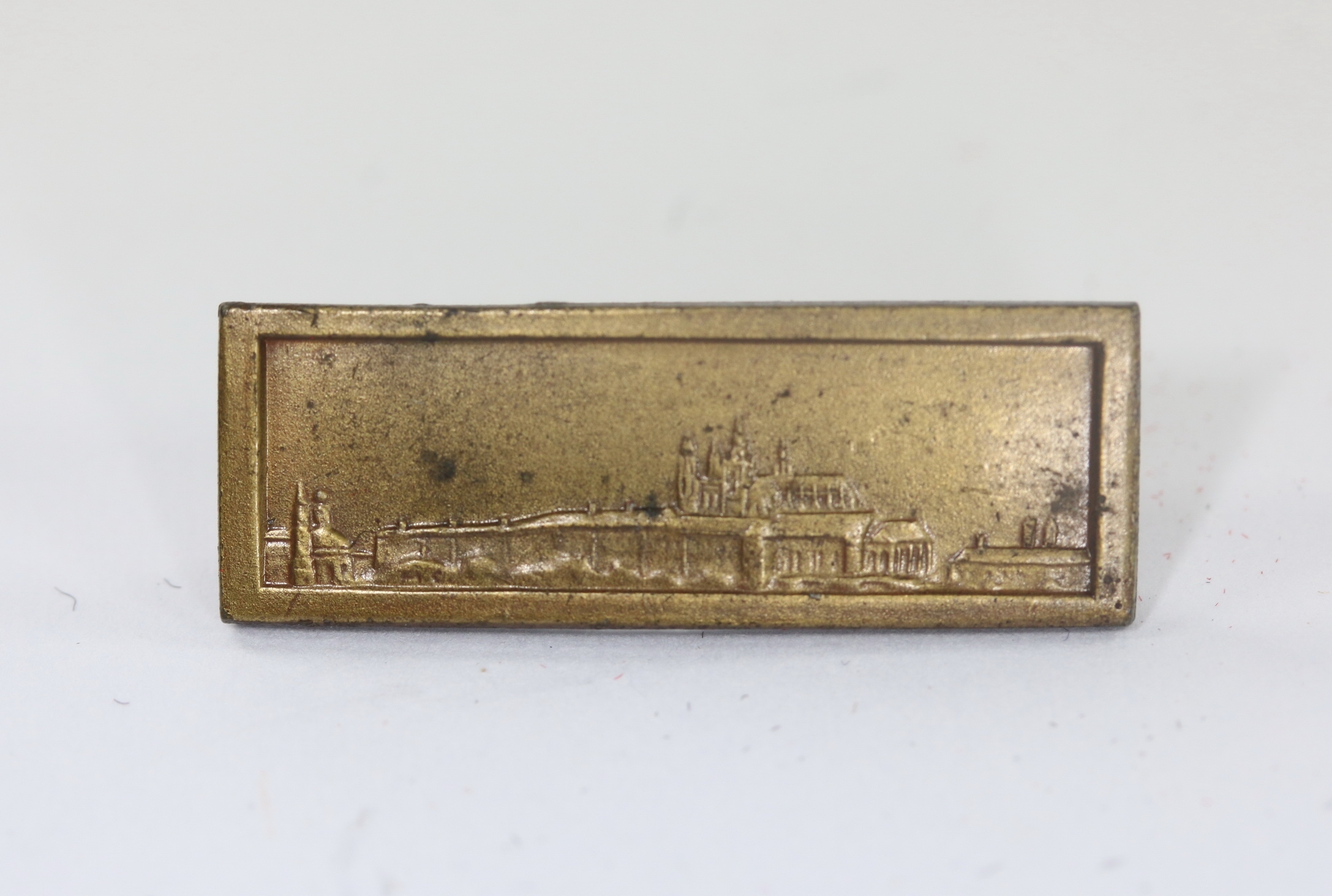 Buntmetall, sehr guter, ungetragener Zustand. Rückseitig mit Hersteller „L/15“ für die Firma otto Schickle, Pforzheim. Vorderseitig mit Künstler Signatur „H.C.“. Die beiden typischen massiven Splinte vollständig vorhanden, einer aber schon mit Riss an der Lötstelle(!).