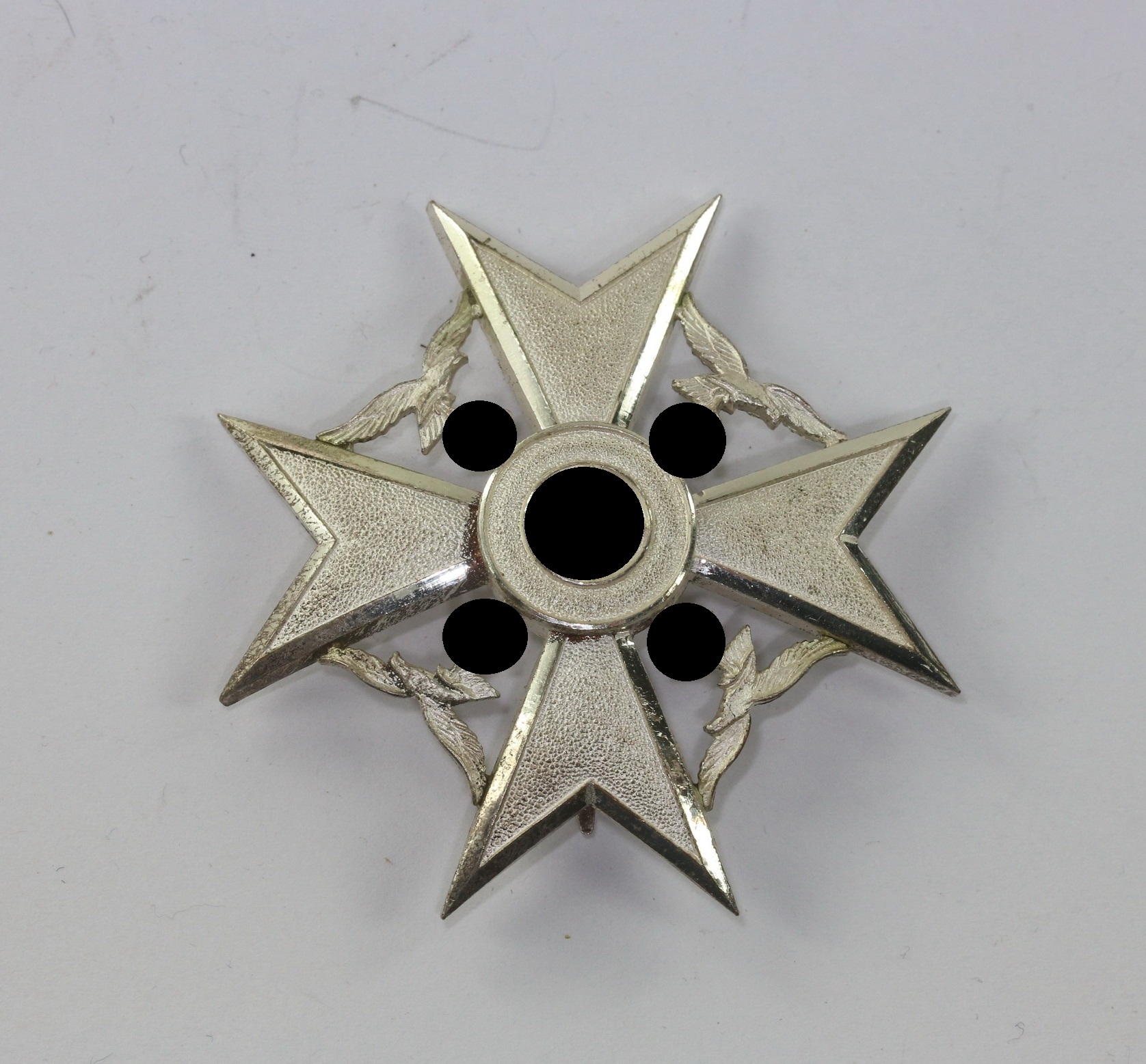 Buntmetall, versilbert, excellnter, nahe zu ungetragener Zustand. Mit vollständiger, frostiger Versilberung, Hakenkreuze und Kanten poliert. Auf der Ndel der Hersteller „4“ für die Firma Steinhauer & Lück, Lüdenscheid. Siehe GCA-Datenbank. Das Stück ohne Schwerter produziert und nicht(!) nachträglich entfernt.