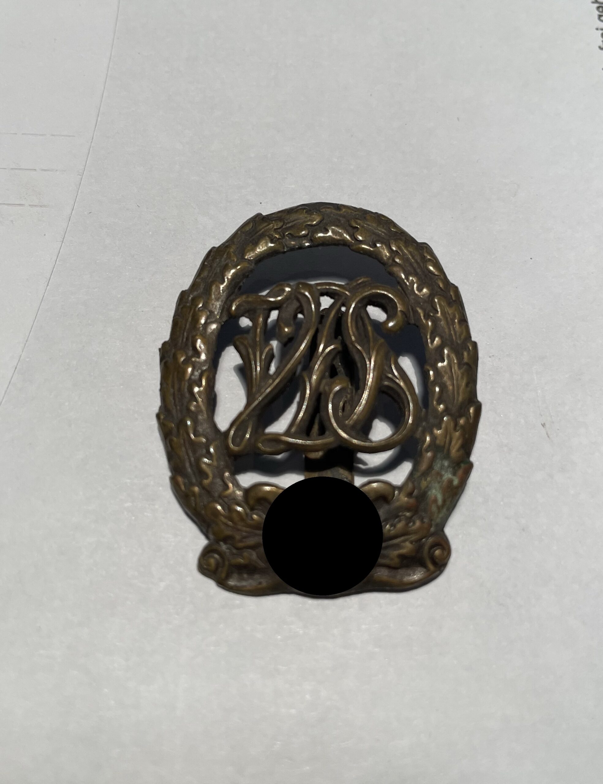 Buntmetall, deutsche Fertigung um 1942. Sehr gut erhaltener, vollständiger Bodenfund. Ähnlich dem Reichssportabzeichen, im Zentrum aber „VDS“ (Volksdeutsches Sportabzeichen) und Sonnenrad, statt Hakenkreuz. Das Nadelsystem repariert!