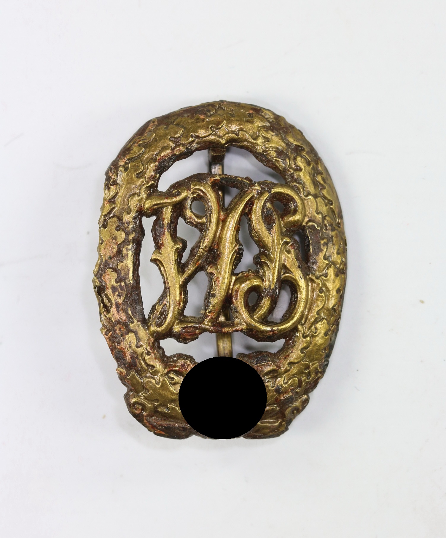 Buntmetall, deutsche Fertigung um 1942. Sehr gut erhaltener, vollständiger Bodenfund. Ähnlich dem Reichssportabzeichen, im Zentrum aber „VDS“ (Volksdeutsches Sportabzeichen) und Sonnenrad, statt Hakenkreuz.