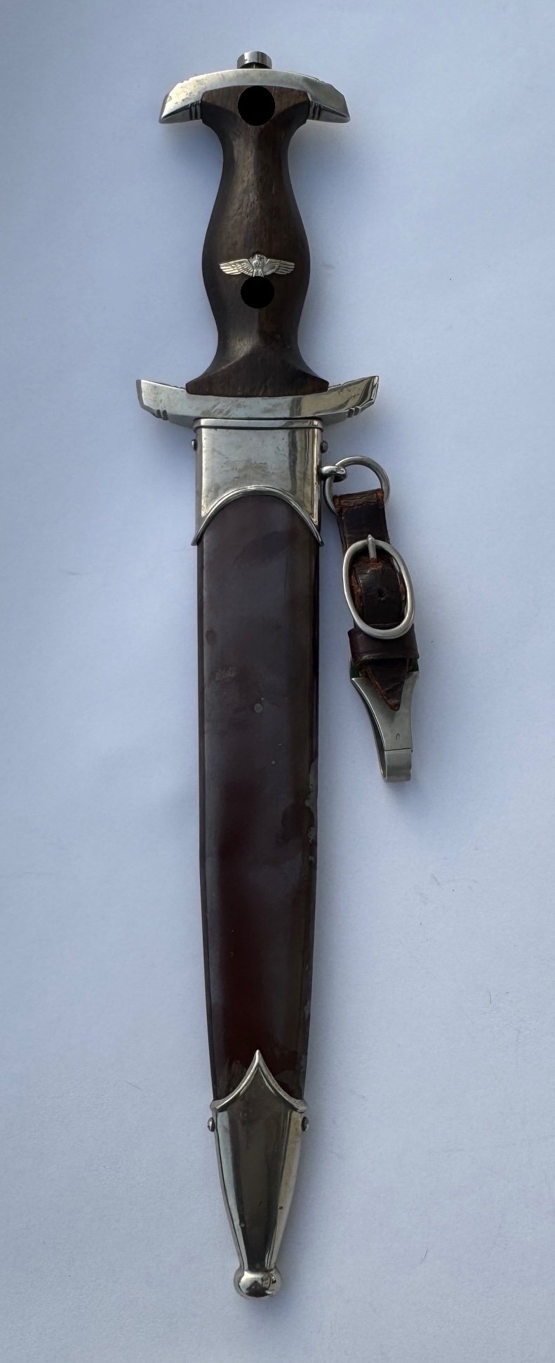 SA Dienstdolch Modell 1933 (M33), sehr guter, nur leicht geführter Zustand. Der braune Griff in einen sehr guten Zustand, ohne Fehler, oder Ausbrüche. Adler und SA-Pastille absolut unberührt. Griff Knebel und Kopfschraube aus Nickelsilber. Die Kopfschraube unberührt. Mit Gaumarke „Sa.“ für Sachsen. Die Scheide aus brünierten Eisenblech mit zwei leichten Beulen. Mund- und Ortblech aus Neusilber, ohne Fehler. Die kleinen Befestigungsschrauben unberührt. Brünierte Scheide mit ca. 90% originaler Brünierung.