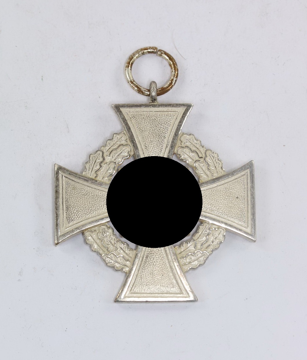 Buntmetall, frostig versilbert, das Hakenkreuz schwarz emailliert, die Kanten poliert. Sehr guter, leicht getragener Zustand. Die schwarze Emaille ohne Fehler. Ohne Trageband!