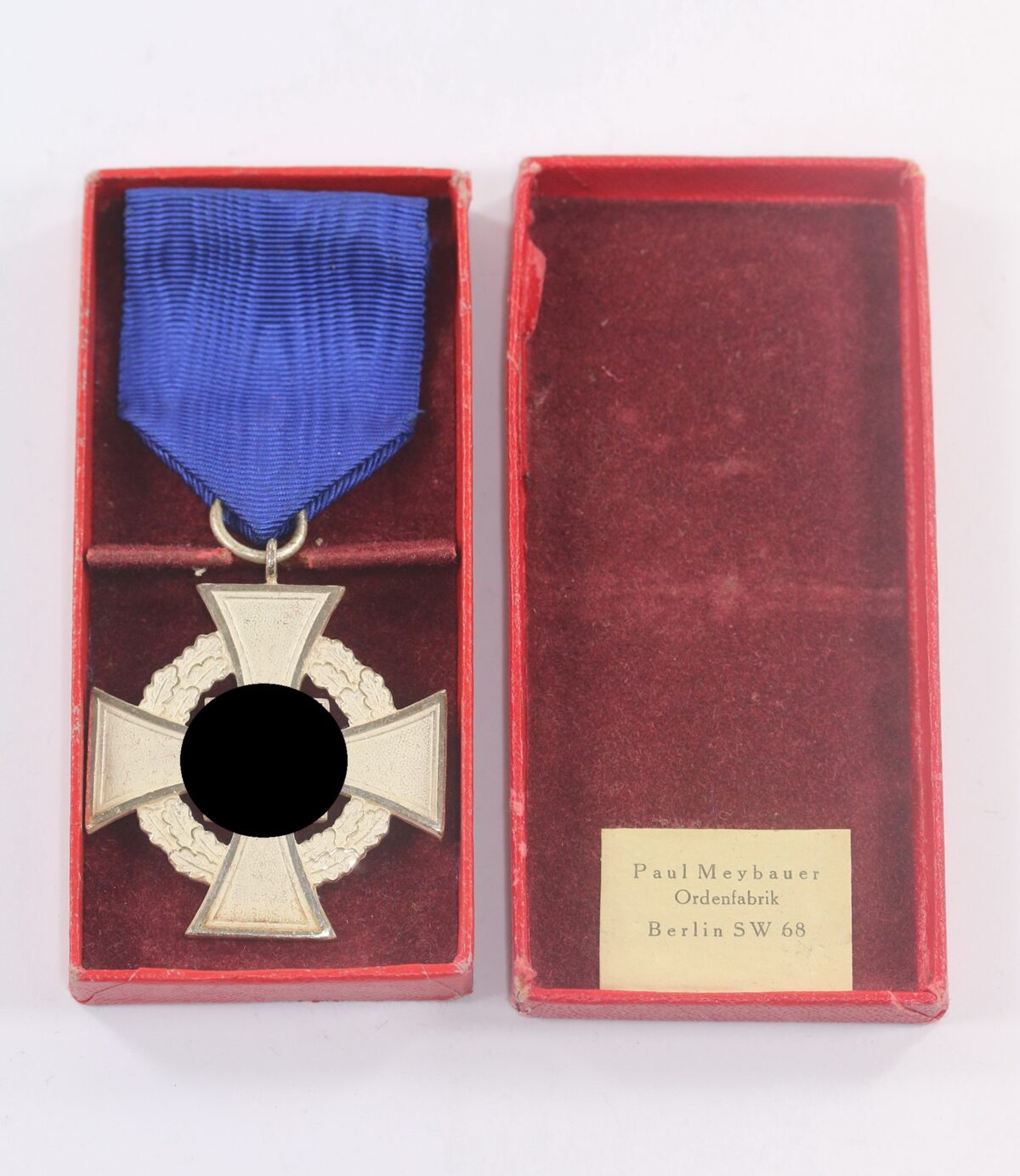 Im zugehörigen im Etui. Das Etui in einen sehr guten, leicht gebrauchten Zustand. Im Deckel der Hersteller Aufkleber „Paul Meybauer Ordensfabrik Berlin SW 68“.