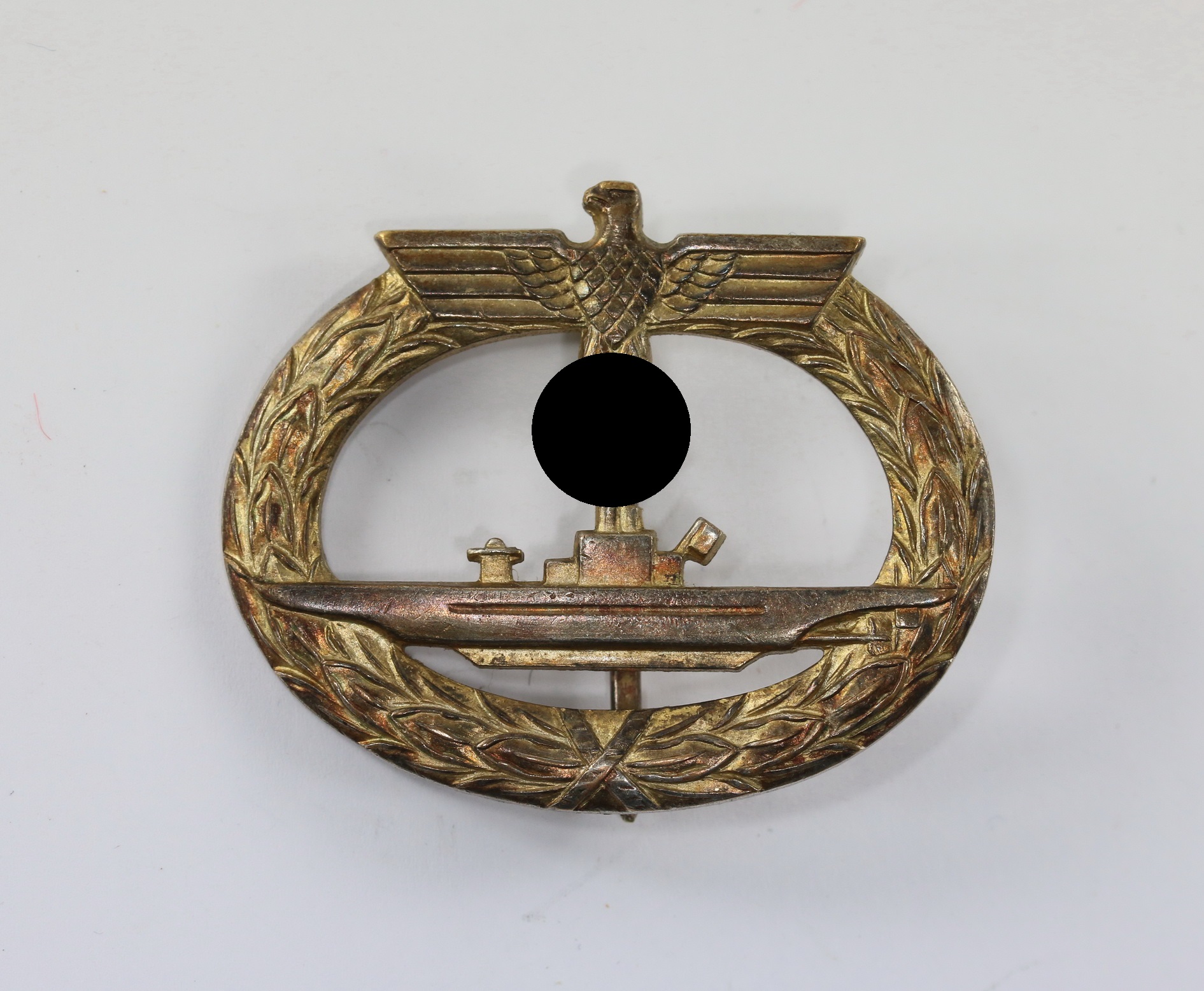 Buntmetall, sehr guter, nur leicht getragener Zustand. Mit vollständiger Vergoldung. Ohne Hersteller, aber eine bekannte Variante der Firma Petz & Lorenz, Untereichenbach. Siehe Weber/Skora, Die Kriegsabzeichen der Kriegsmarine, S. 64/65, Typ 1.06. Mit den typischen, markanten Nadelsystem.