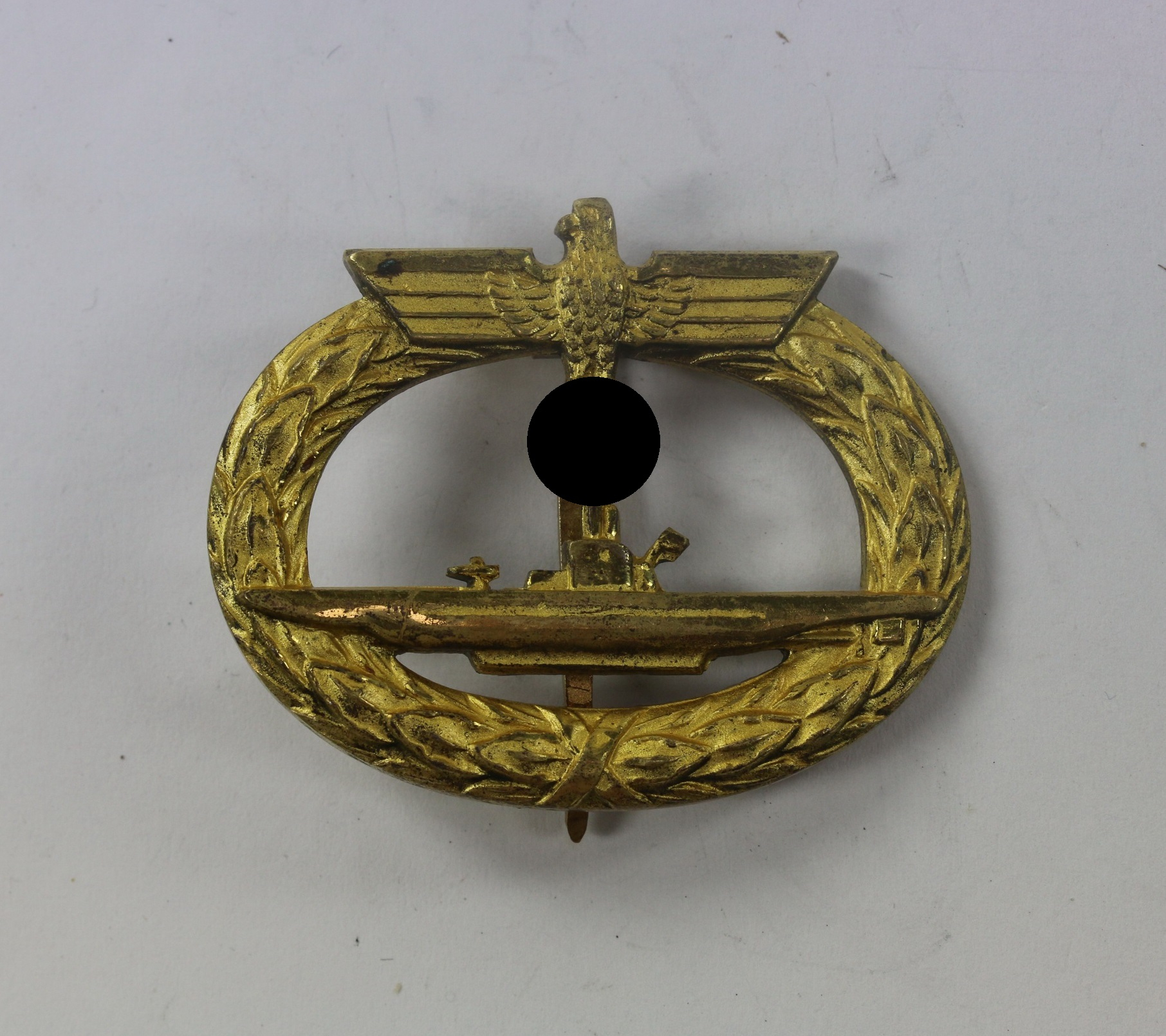 Buntmetall, feuervergoldet, sehr guter, leicht getragener Zustand. Mit vollständiger, strahlender Vergoldung. Hakenkreuz und Kanten poliert. Ohne Hersteller, aber eine bekannte Variante der Firma Schwerin, Berlin. Siehe Weber/Skora, Die Kriegsabzeichen der Kriegsmarine.
