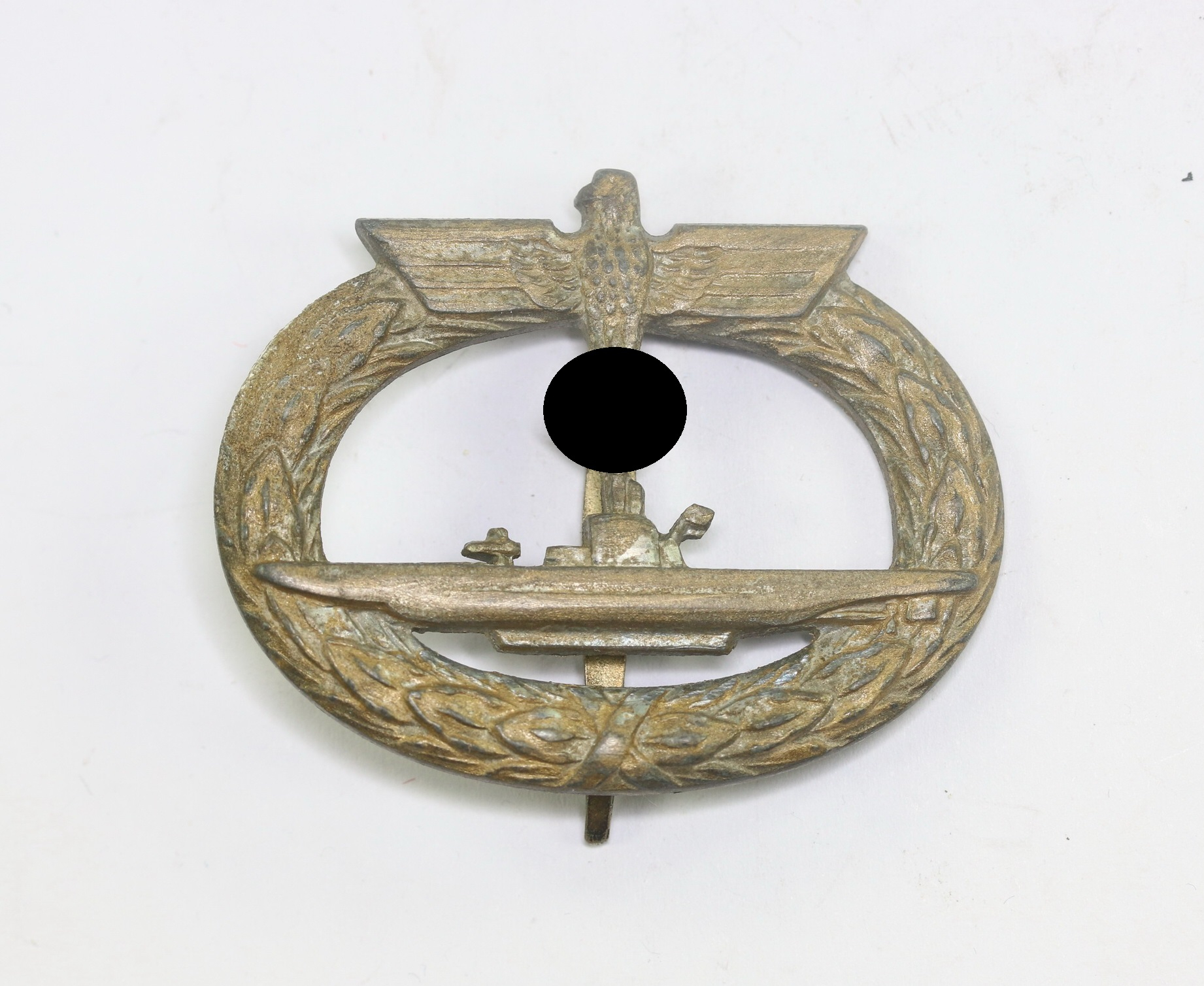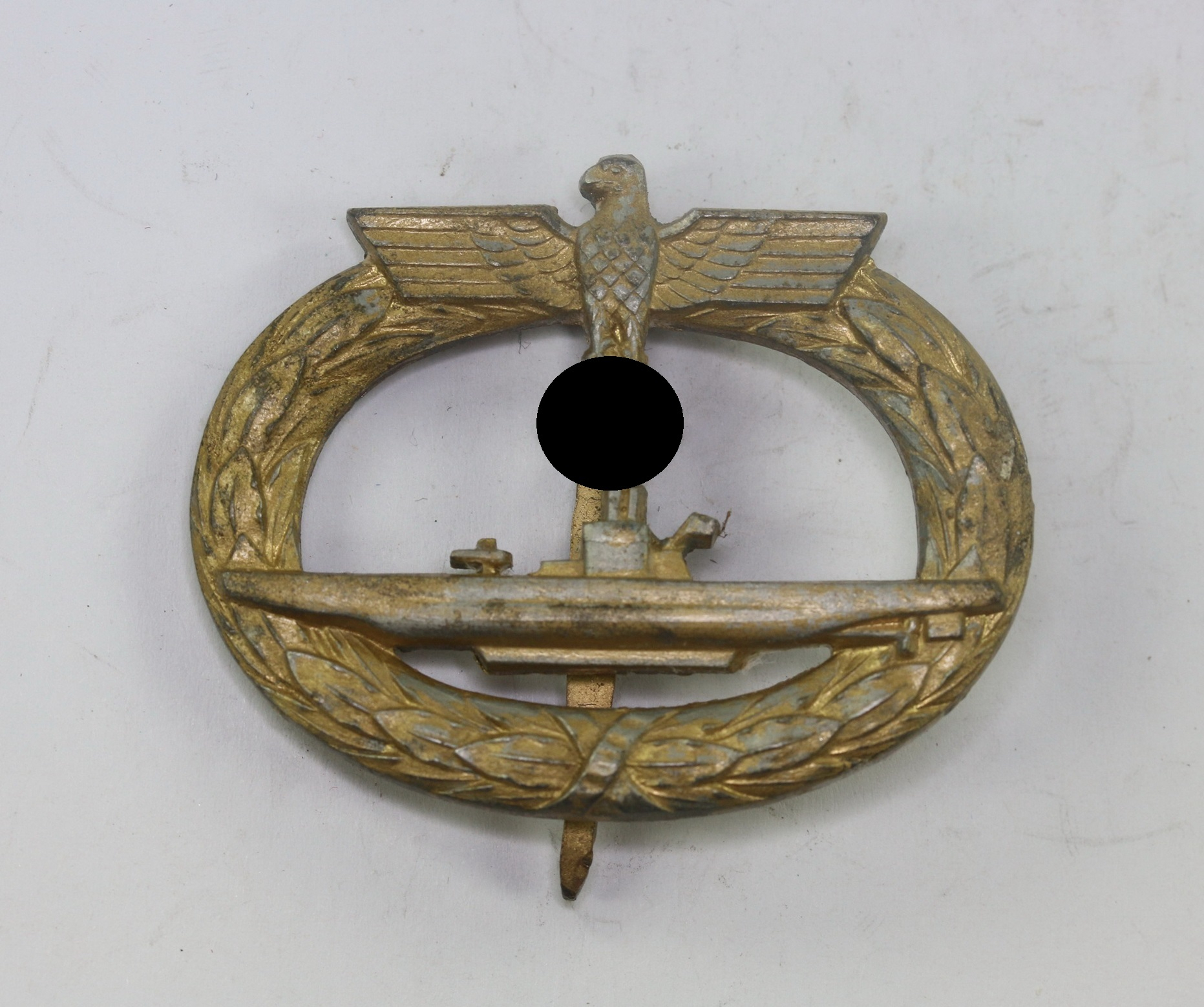 Zink, sehr guter, nur leicht getragener Zustand. Mit noch sehr schöner Vergoldung und leichter Patina.Ohne Hersteller, aber eine bekannte Variante. Siehe Weber/Skora, Die Kriegsabzeichen der Kriegsmarine, Typ 1.42.