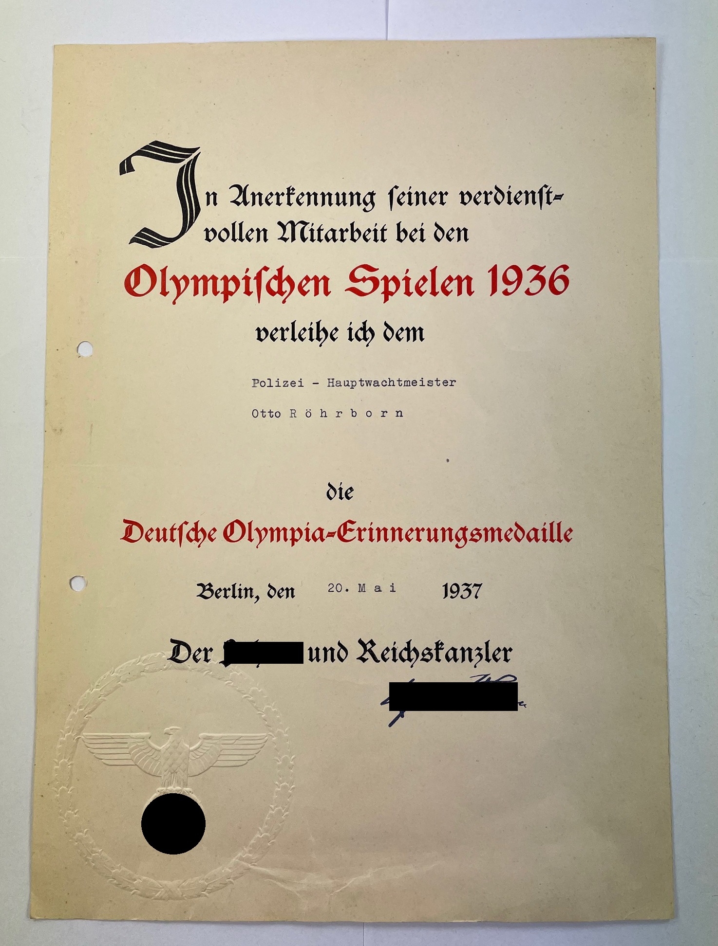 Urkunde Deutsche Olympia-Erinnerungsmedaille