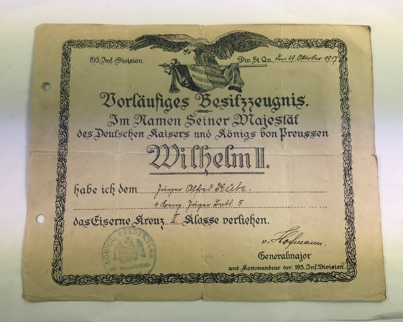 Sehr guter, leicht gebrauchter Zustand. Gefaltet und gelocht. Schöner Vordruck.