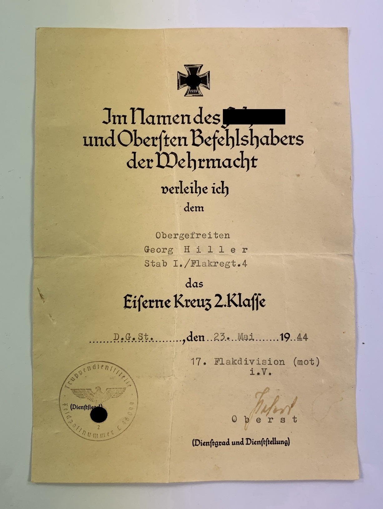 Urkunde Eisernes Kreuz 2. Klasse 1939, Flak