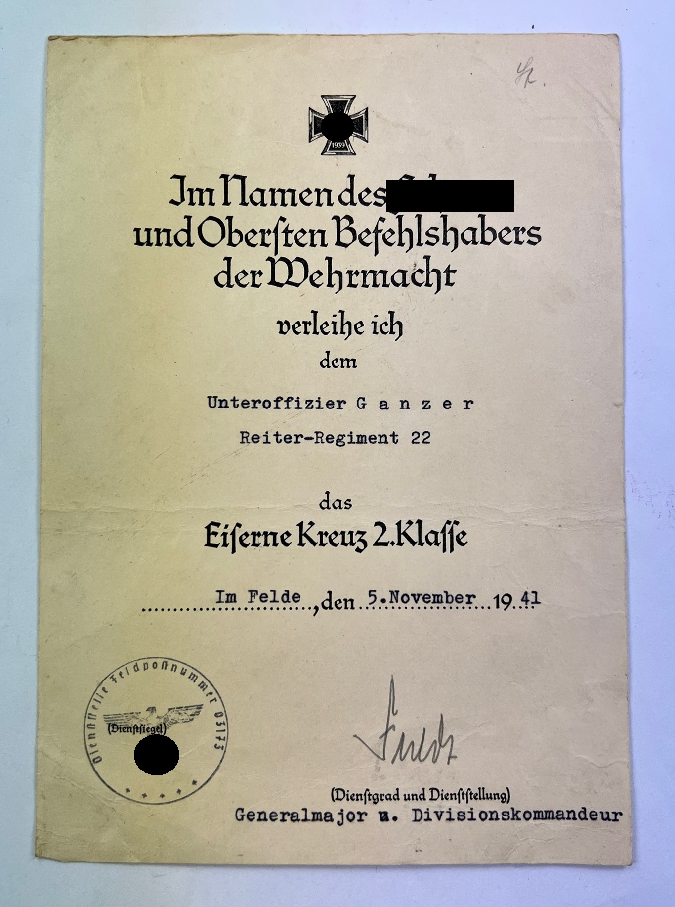 Urkunde Eisernes Kreuz 2. Klasse 1939, Reiter-Regiment 22