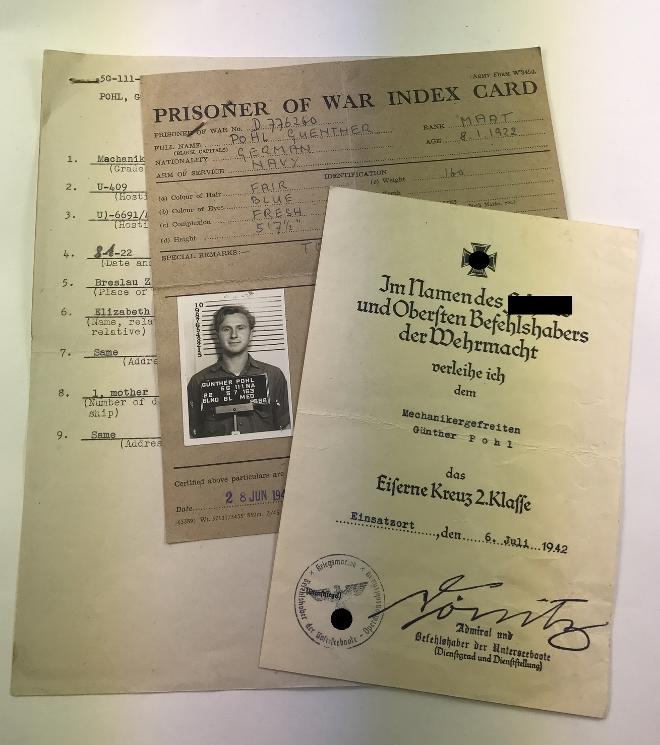Urkunde und Papiere des Mechanikergefreiten Günther Pohl. Der Gefreite fuhr auf U-409 bei sieben Unternehmungen. Das Boot versenkte sich, nach schweren Beschädigungen durch ein britisches Kriegsschiff, am 12.7.1943 im Mittelmeer selbst. Der größte Teil der Besatzung kam ums Leben, der gefreite Pohl wurde gerettet und kam in britische Kriegsgefangenschaft.