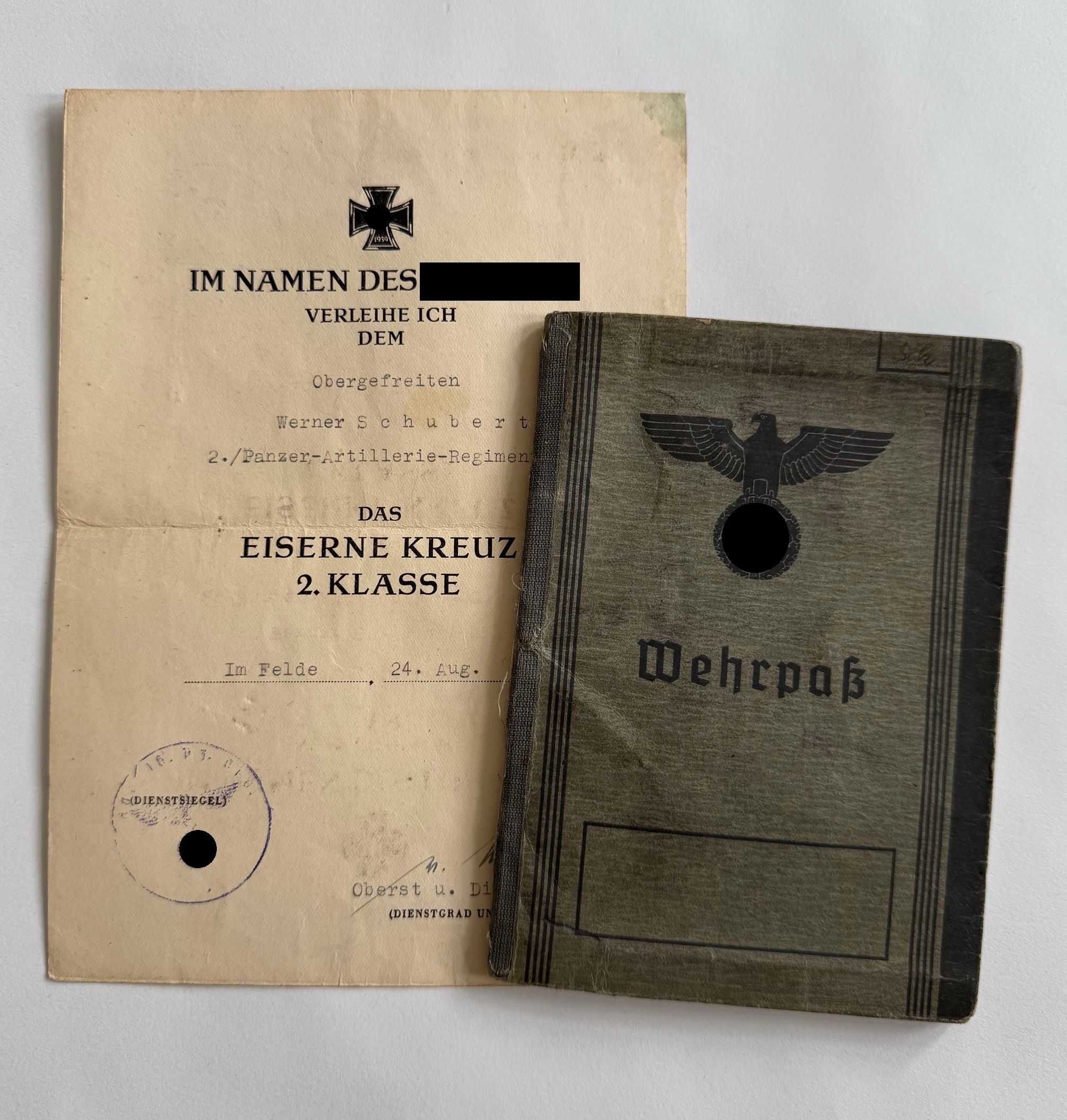 Wehrpaß und Urkunde für das Eiserne Kreuz 2. Klasse für den Obergefreiten Werner Schubert.