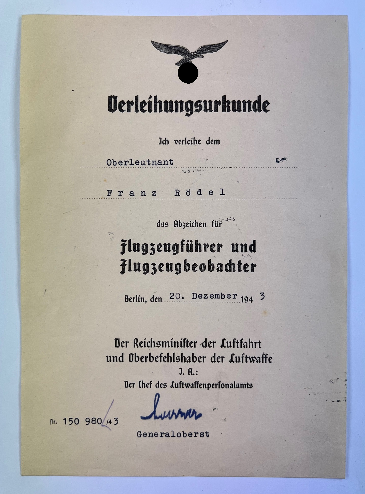 Urkunde Flugzeugführer und Flugzeugbeobachter (Doppelabzeichen)
