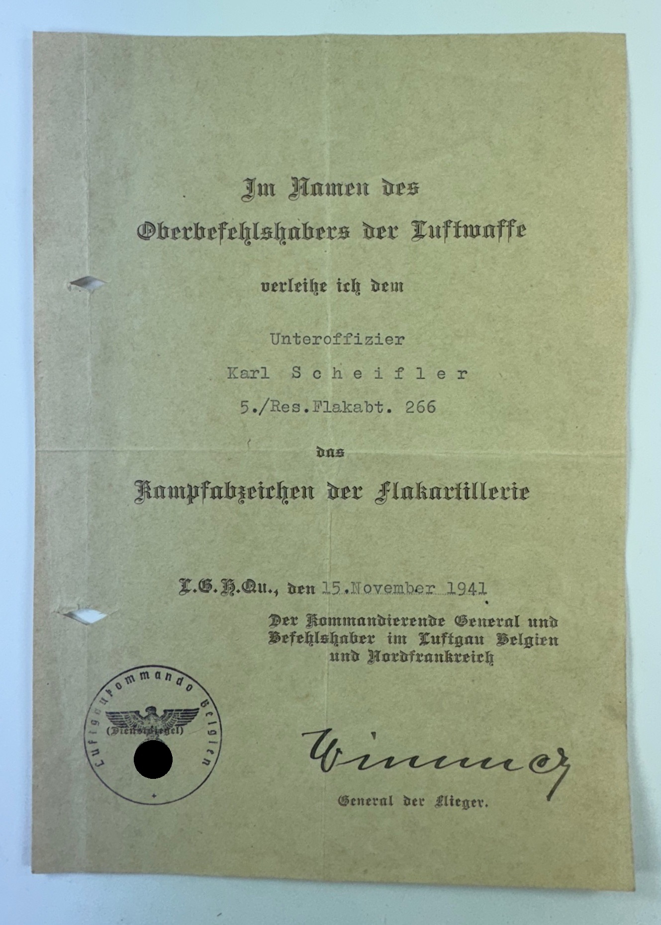 Gelocht, sonst sehr guter, leicht gberauchter Zustand. original Unterschrift. Seltener Vordruck.
