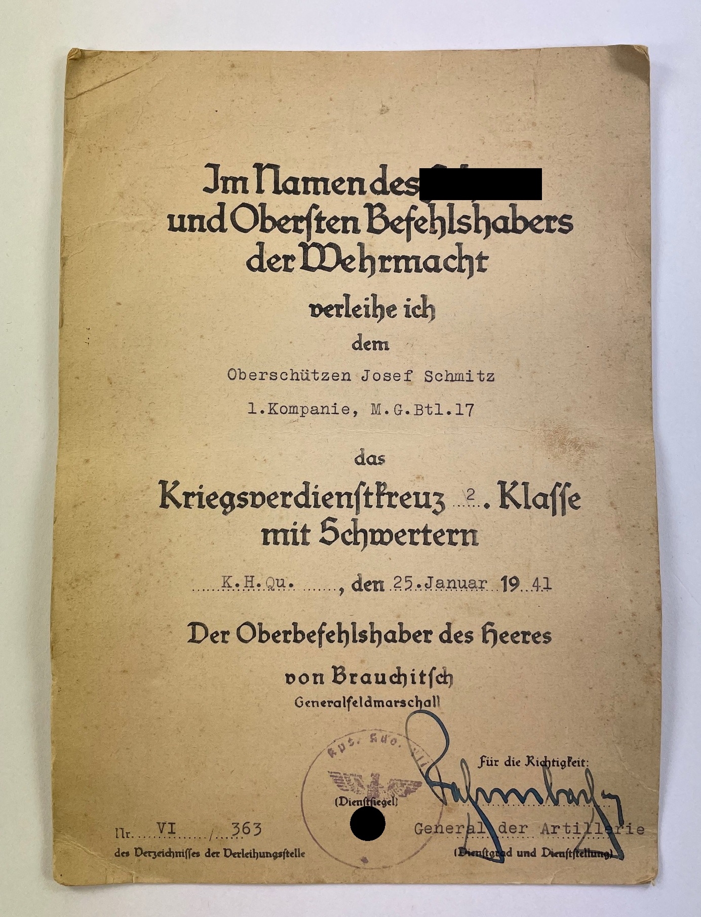 Urkunde Kriegsverdienstkreuz 2. Klasse mit Schwertern