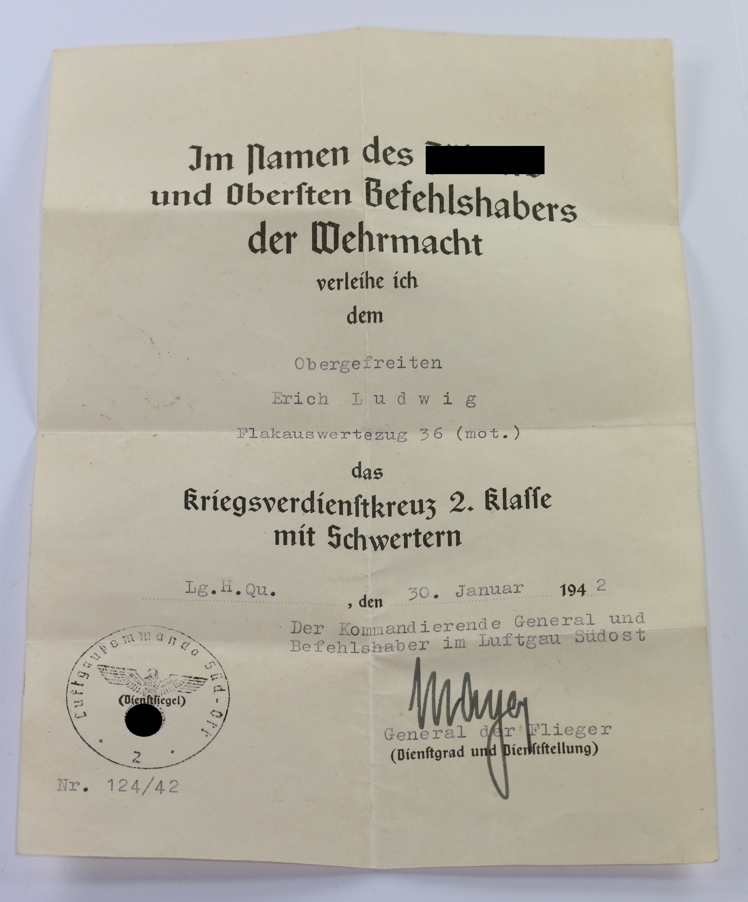 Urkunde Kriegsverdienstkreuz 2. Klasse mit Schwertern, Flakauswertungszug