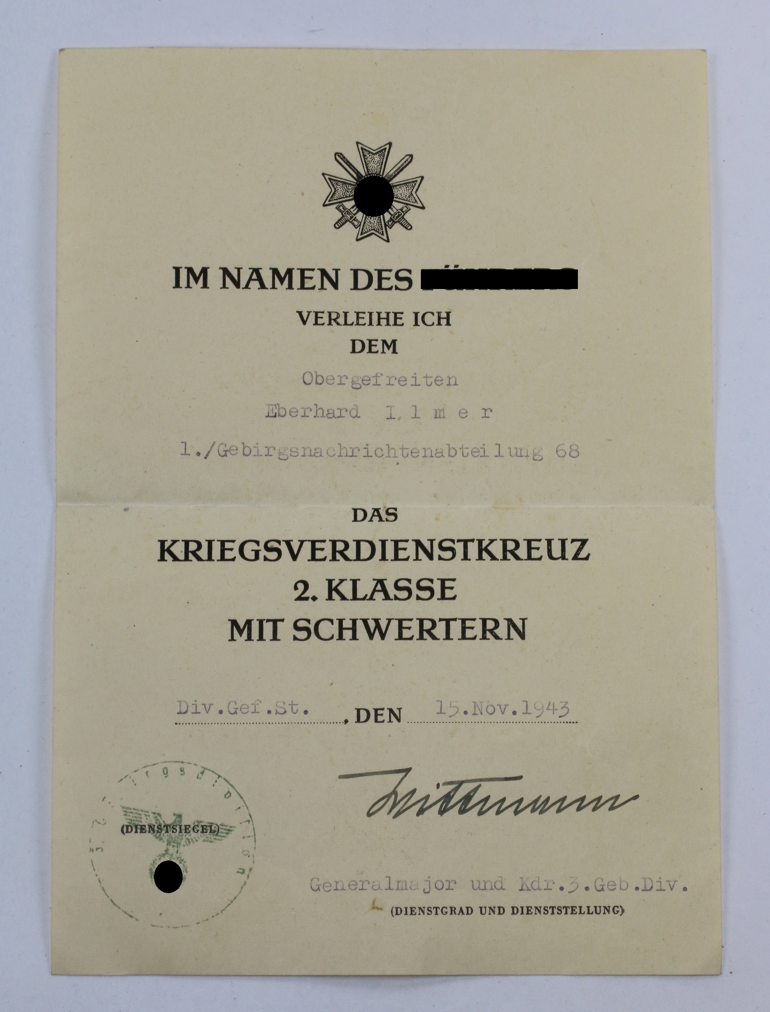 Urkunde Kriegsverdienstkreuz 2. Klasse mit Schwertern, Gebirgsjäger
