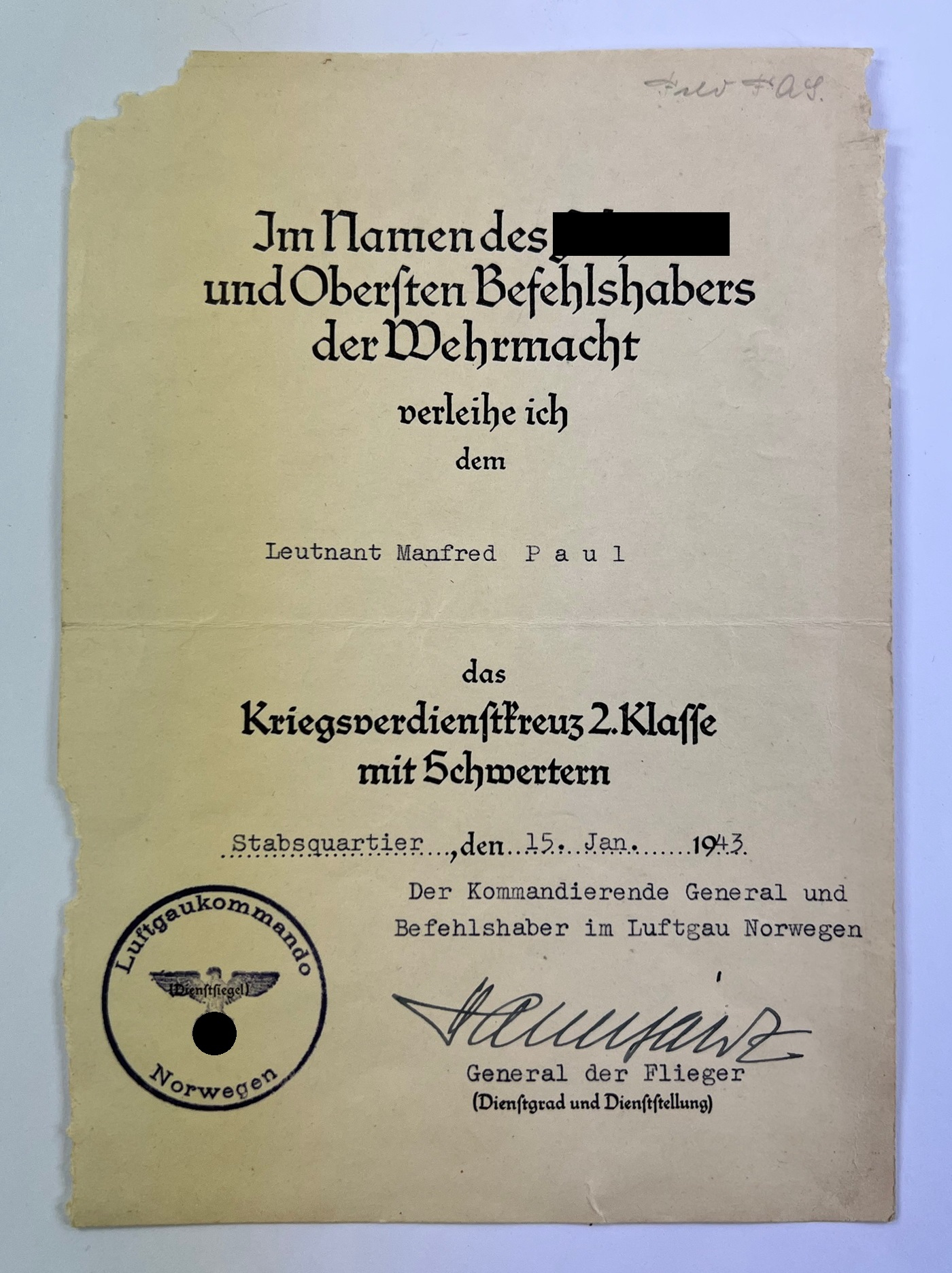 Urkunde Kriegsverdienstkreuz 2. Klasse mit Schwertern, Luftgaukommando Norwegen