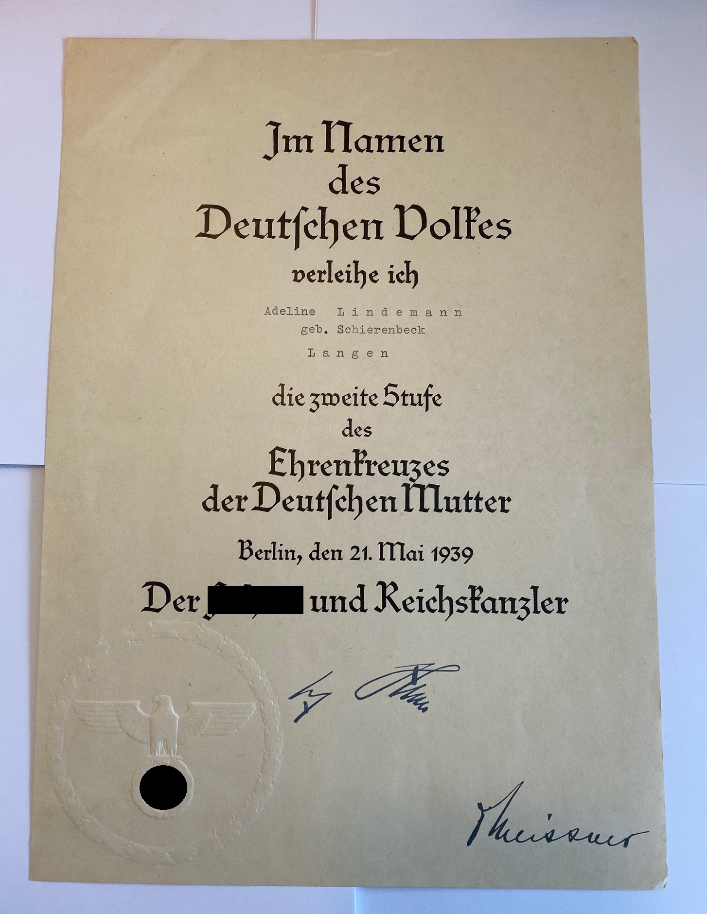 Urkunde Mutterkreuz in Gold