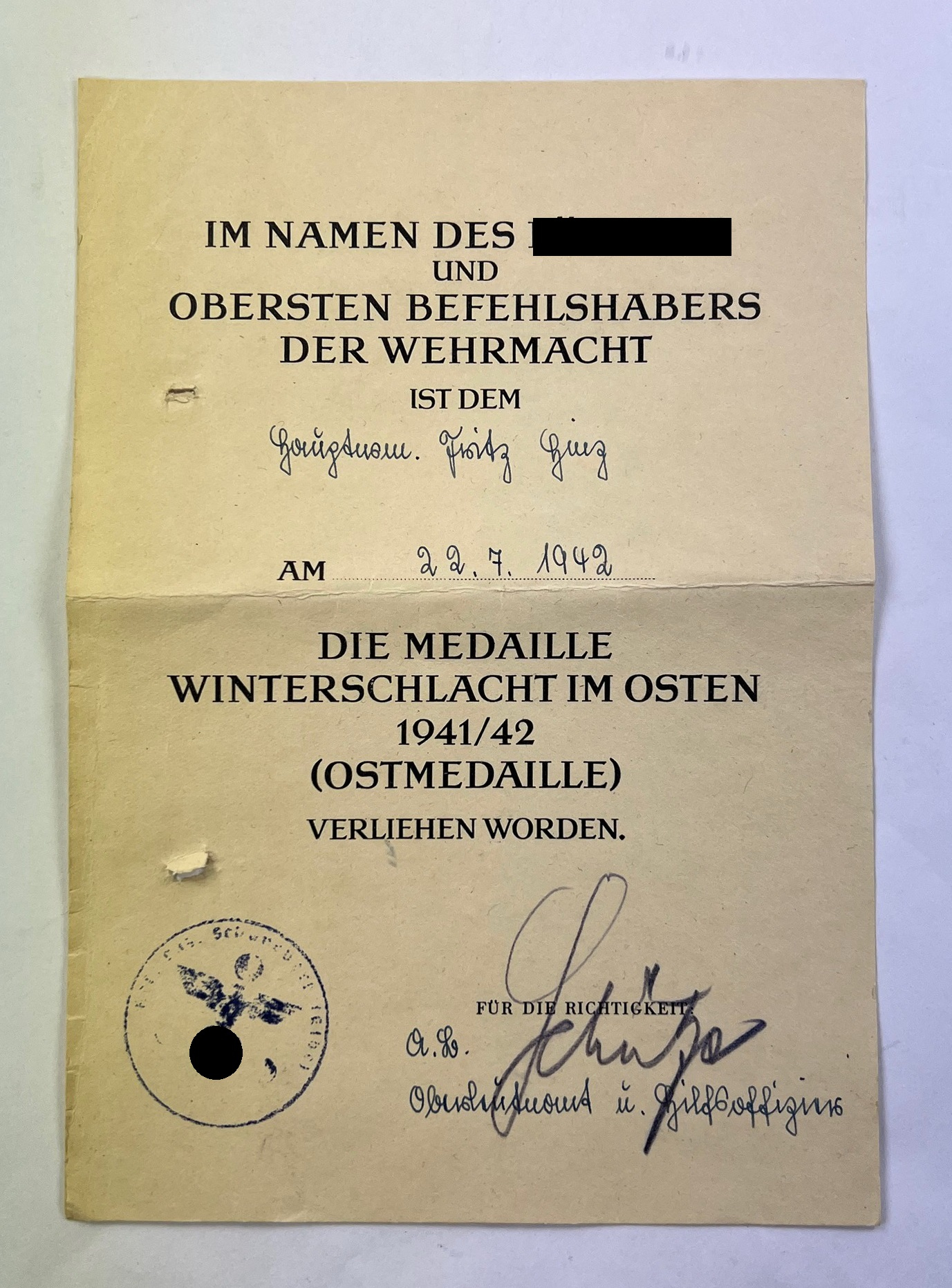Urkunde Ostmedaille / Medaille Winterschlacht im Osten 1941/42