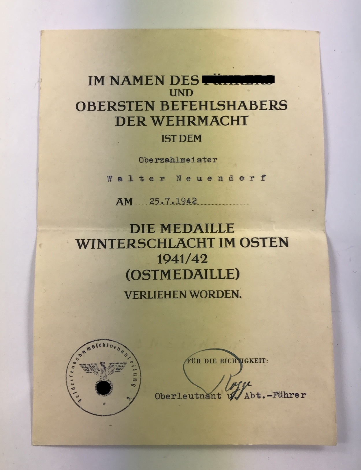 Sehr guter, nur leicht gebrauchter Zustand. Für den Oberzahlmeister Walter Neuendorf.
