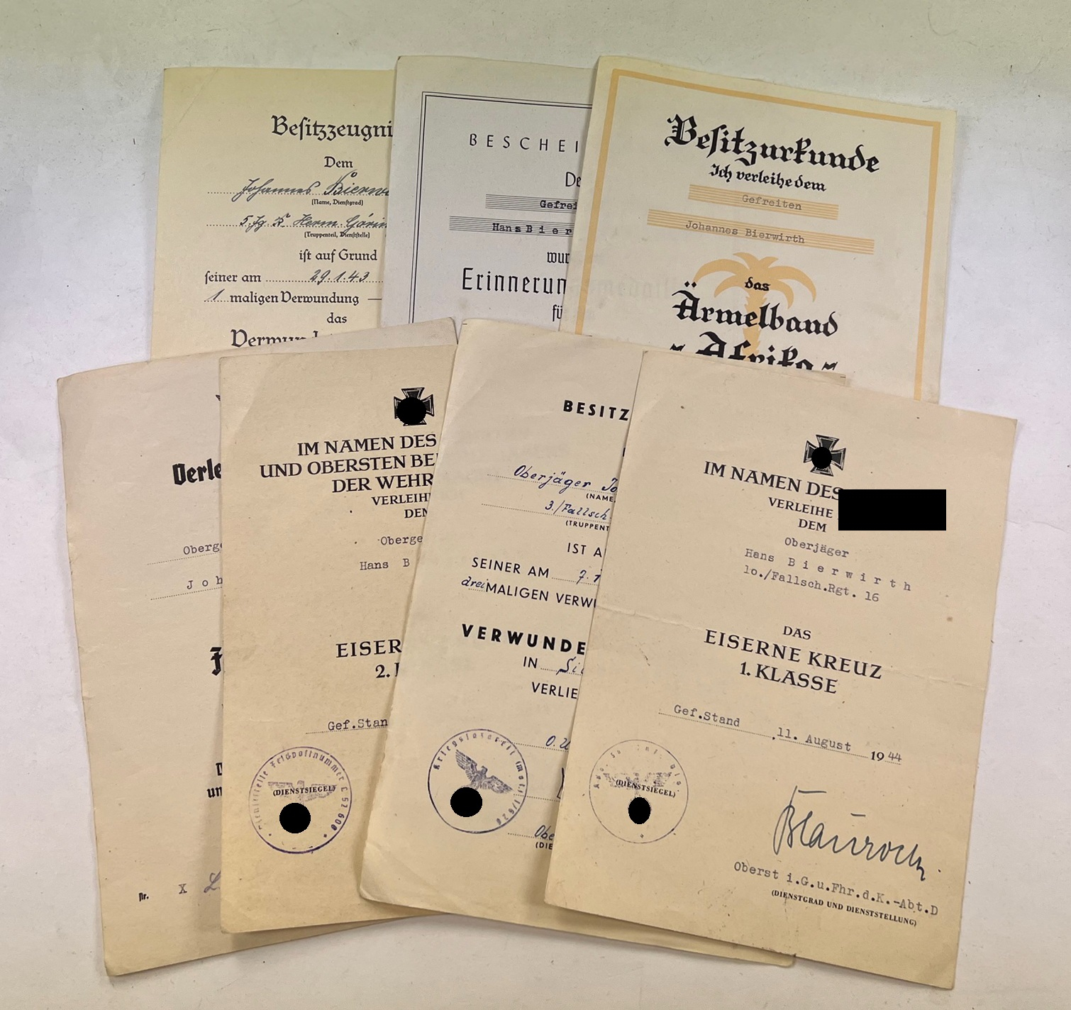 Urkunden Nachlass des Oberjägers Hans Bierwirth. Eingestzt u.a. in Afrika, der Invasionsfront und der Oatfront. Alle Urkunden in einen sehr guten, nur leicht gebrauchten Zustand.Der Nachlass besteht aus: