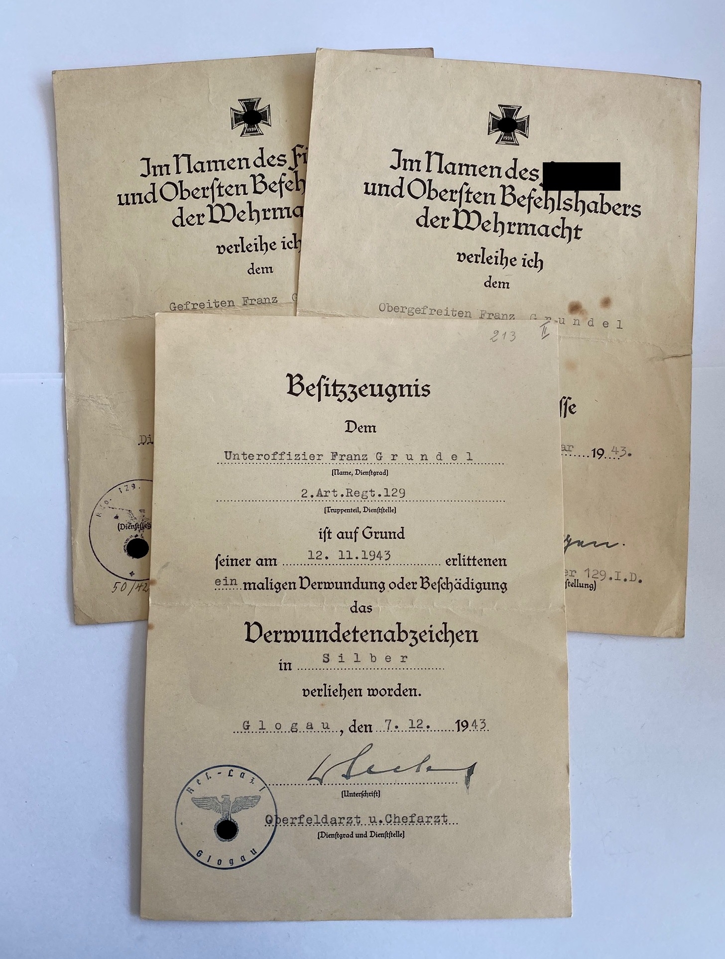 Urkunden des Unteroffiziers Franz Grundel. Alle Urkunden in einen sehr guten, nur leicht gebrauchten Zustand.