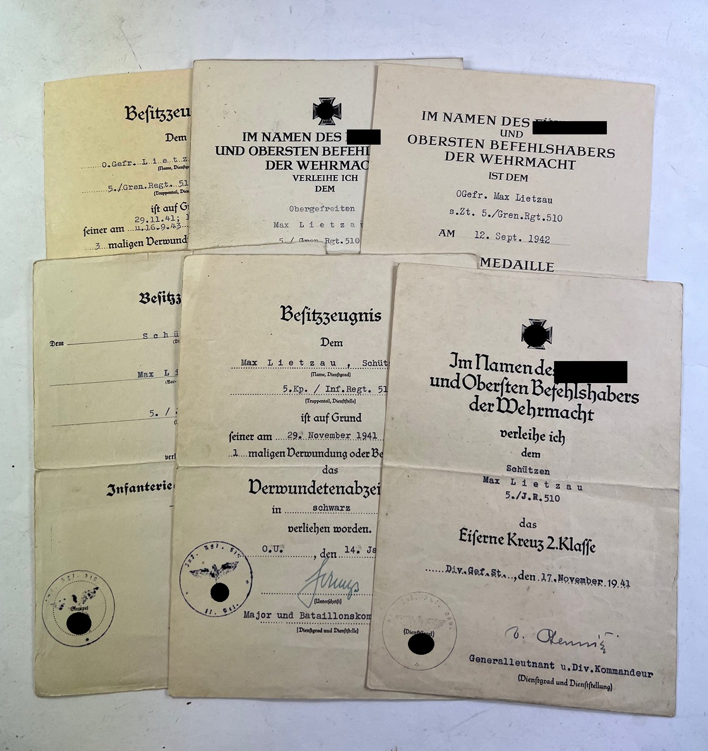 Urkunde des Obergefreiten Max Lietzau. Alle Urkunden in einen sehr guten, nur leicht gebrauchten Zustand.
