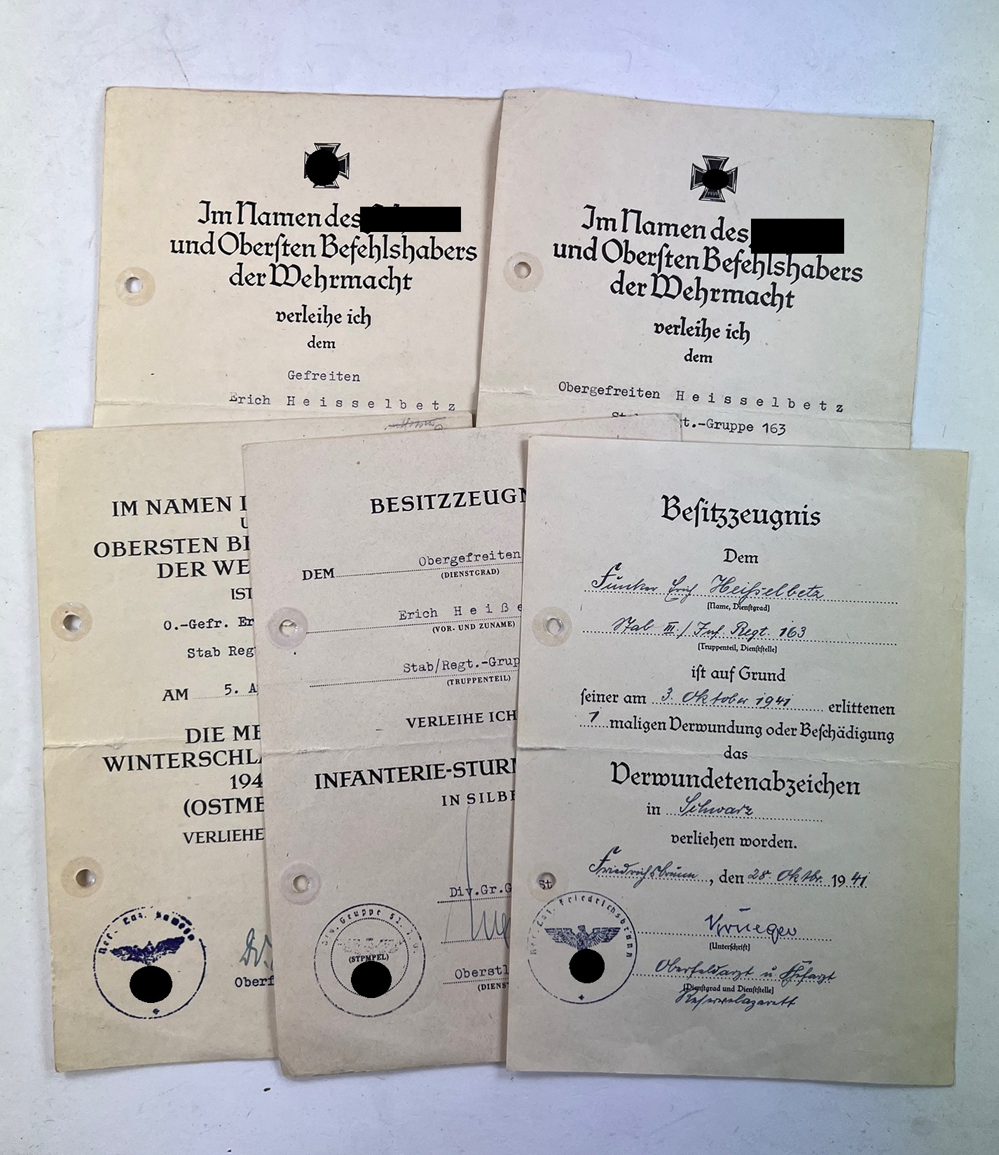 Urkunden Gruppe des Obergefreiten Erich Heißelbetz. Alle Urkunden in einen sehr guten, gelochten und leicht gebrauchten Zustand. Der Nachlass bestht aus: