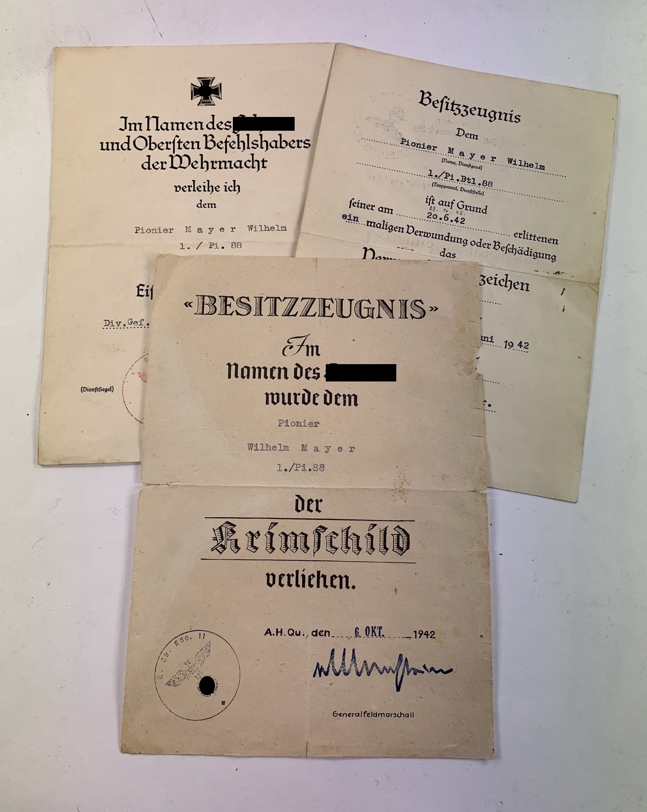 Urkunden Nachlass des Pionier Wilhelm Mayer. Er diente im Pionier Bataillon 88. Alle Urkunden in einen sehr guten, gebrauchten Zustand.