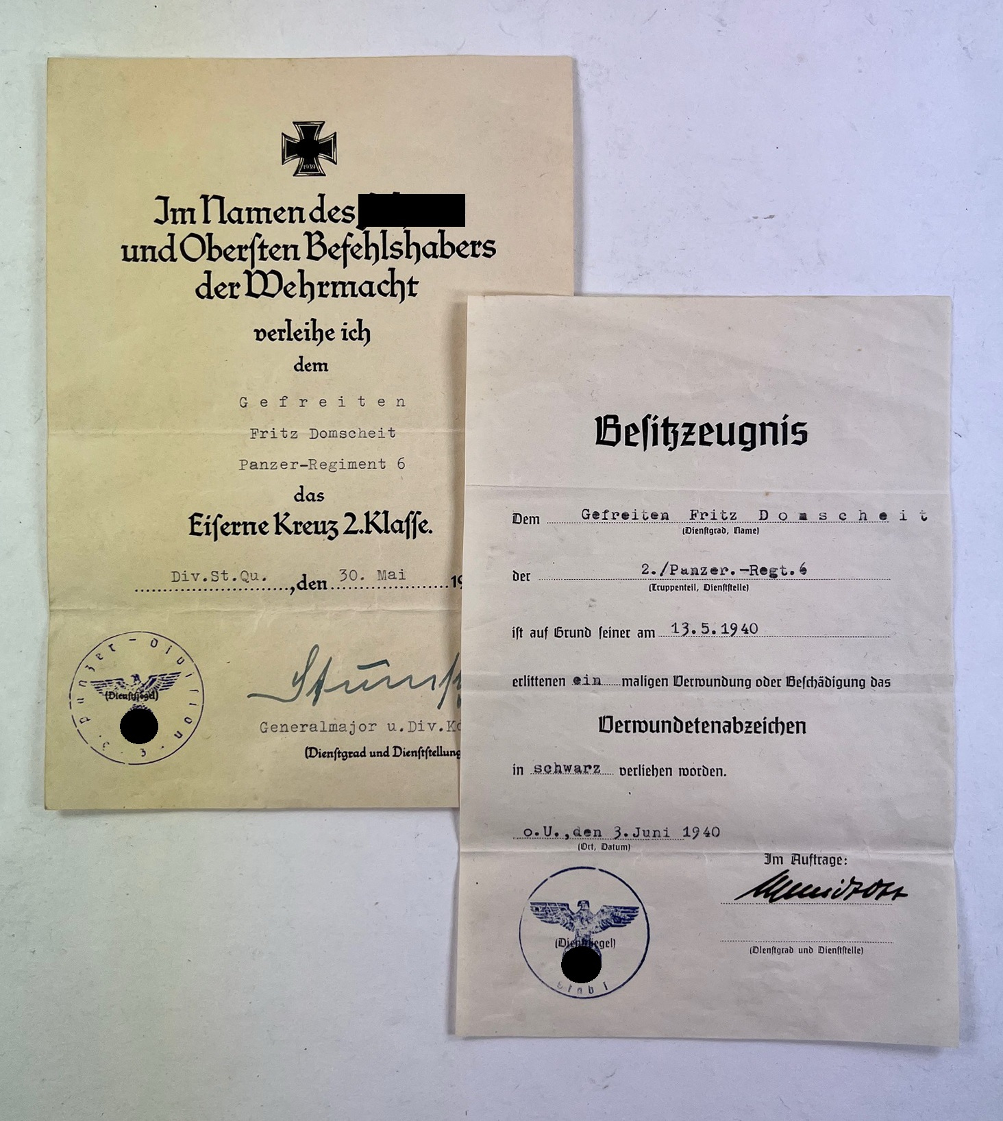 Urkunden des Gefreiten Fritz Domscheit. Er diente im Panzer-Regiment 6.
