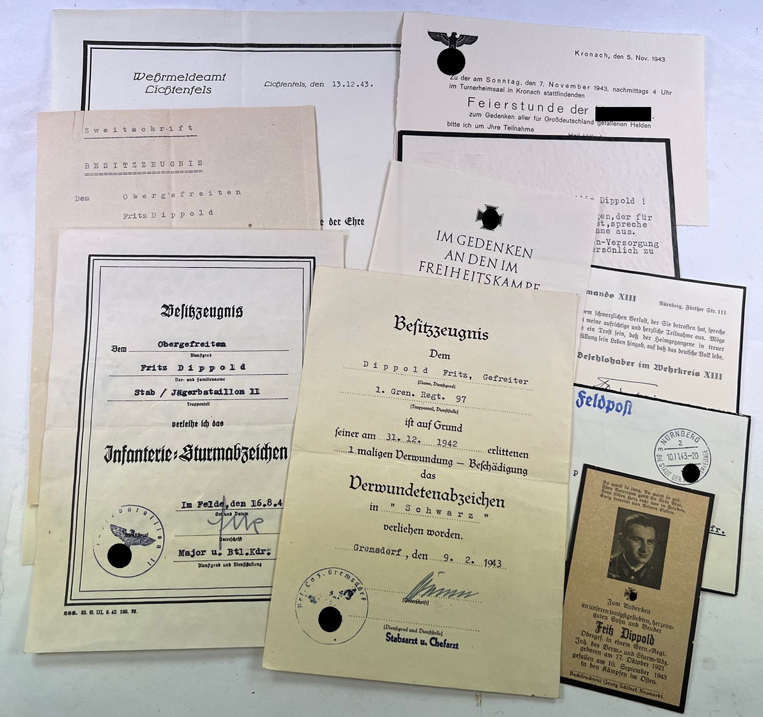 Urkunden und Dokumente des Obergefreiten Fritz Dippold.