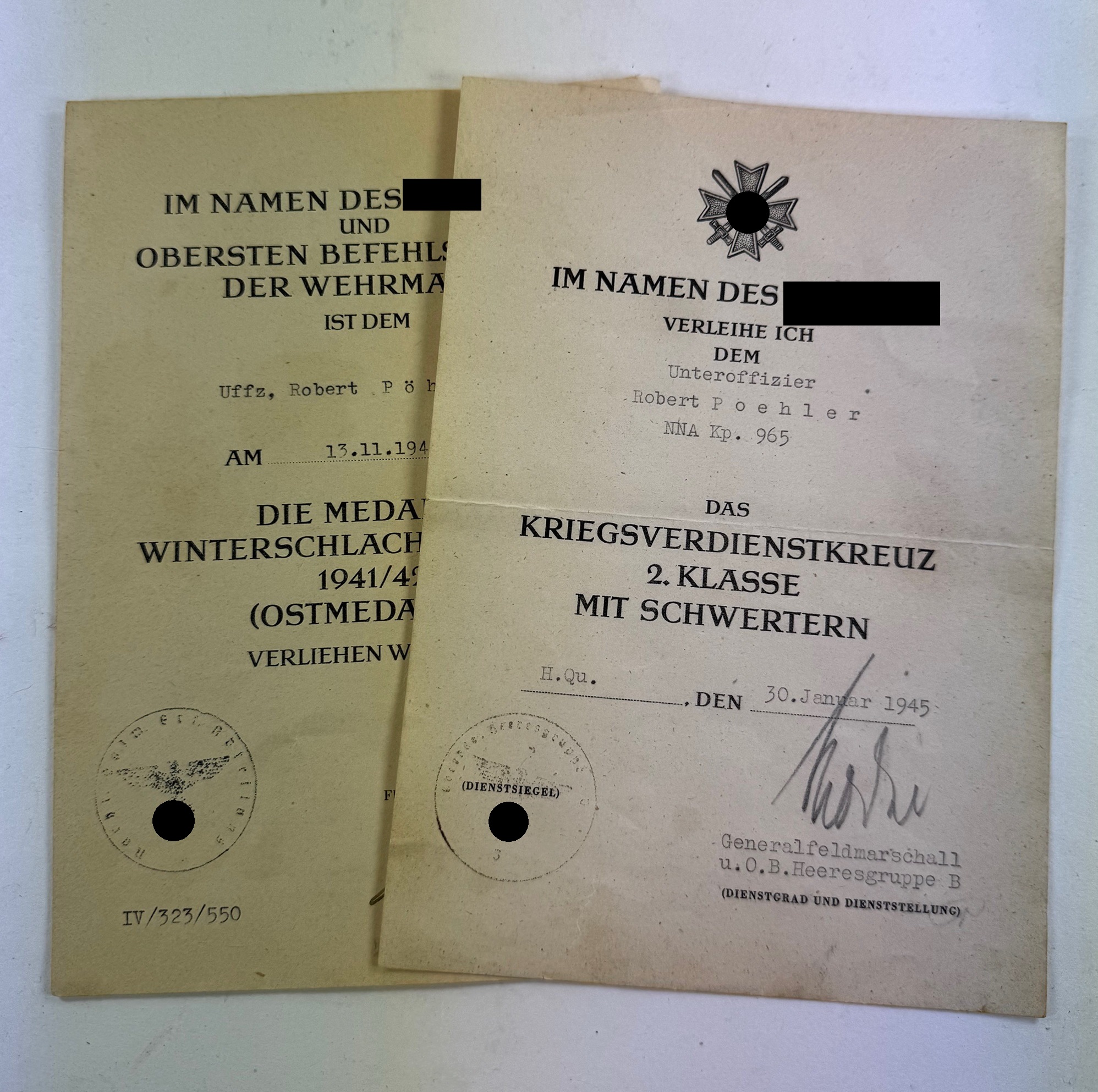 Zwei Urkunden aus den Nachlass des Unteroffiziers Robert Poehler. Der Unteroffizier diente in der Nachrichten Nah-Aufklärungs Kompanie 965 (NNA 965).